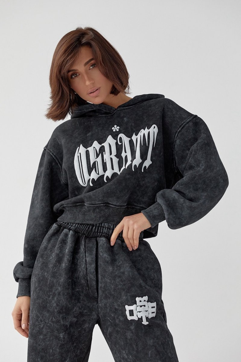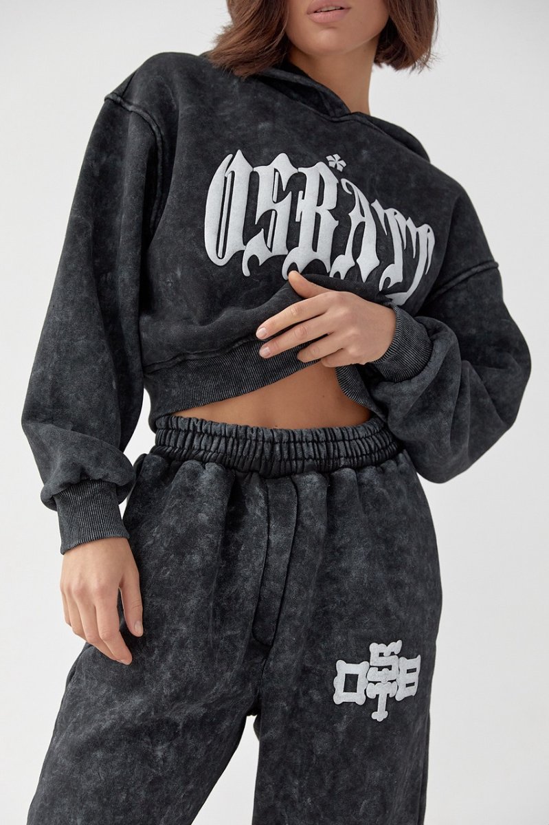 Цей комплект з джогерами та худі ви зможете доповнювати і елегантним пальто, і молодіжною стьобаною курткою. Штани йдуть з резинкою, вшитою внизу та в поясі, а також із зручними кишенями у бічних швах. Капюшон худі виконаний без підкладки, прямий низ виробу і довгі рукави обшиті манжетами. Спереду кофта прикрашена написом "Osbatt", а на джогерах аналогічний напис розташований зліва вгорі.