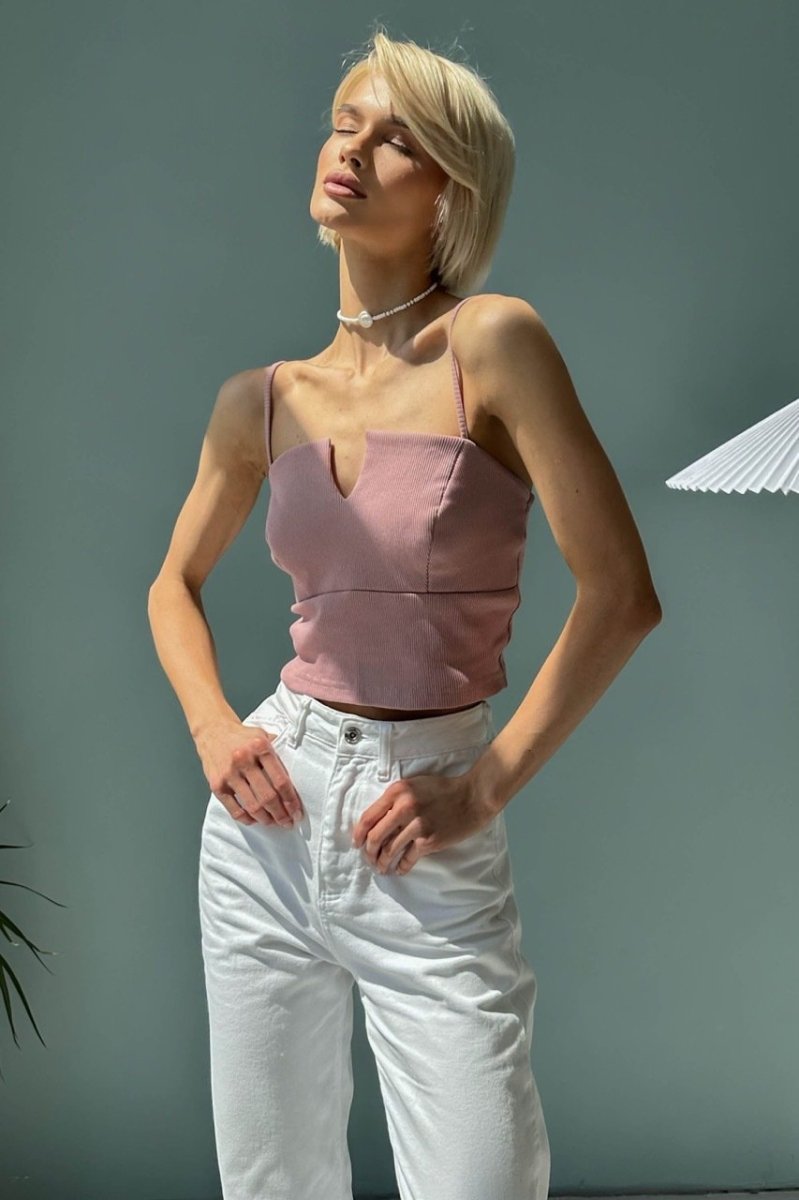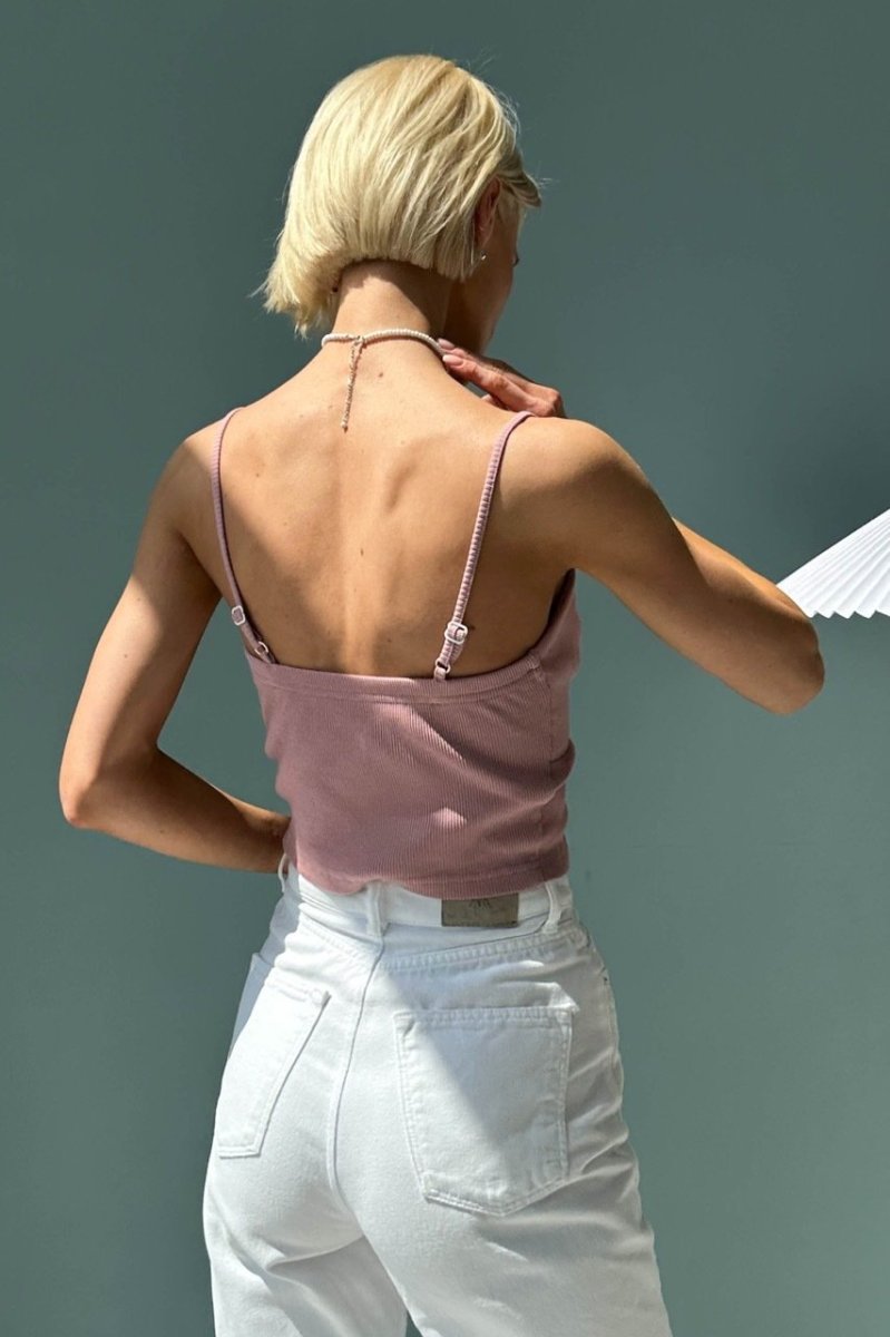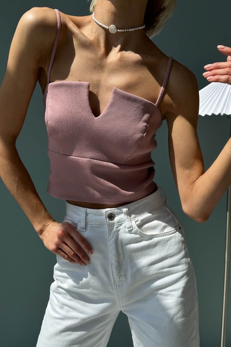 Облягаючий літній топ на тонких бретелях.- універсальне доповнення для повсякденних образів з джинсами, спідницями або широкими брюками. Виконали з тонкого трикотажу у дрібний рубчик. Довжина бретелей регулюється, лиф на поролоні.