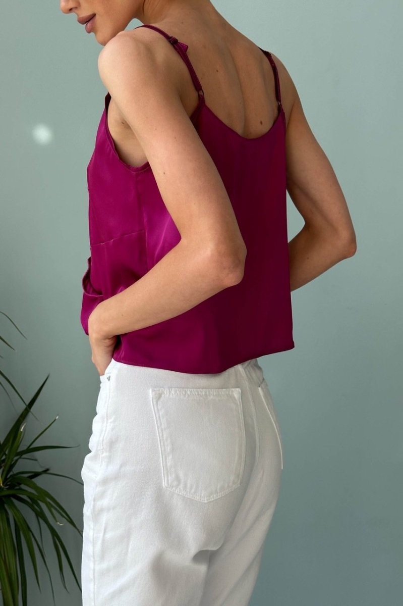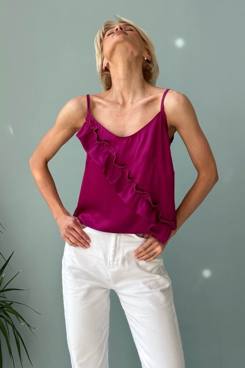 Оригінальний топ із штучного шовку «Армані». Тонкі бретелі, що регулюються, ніжна рюша по переду – модель підійде як для створення романтичних вечірніх образів, так і для повсякдення.