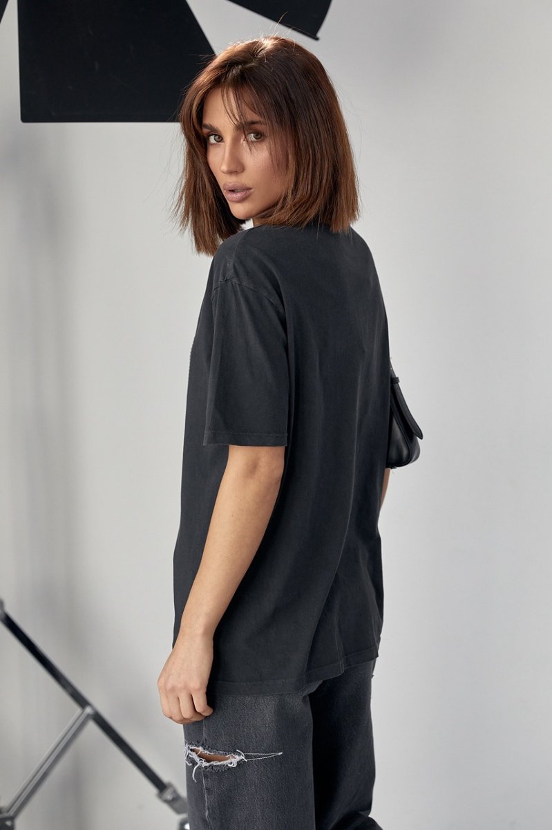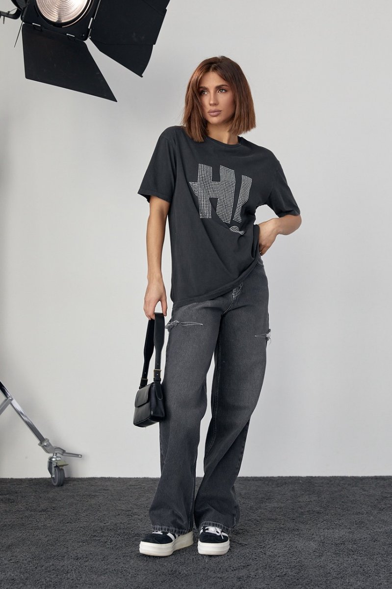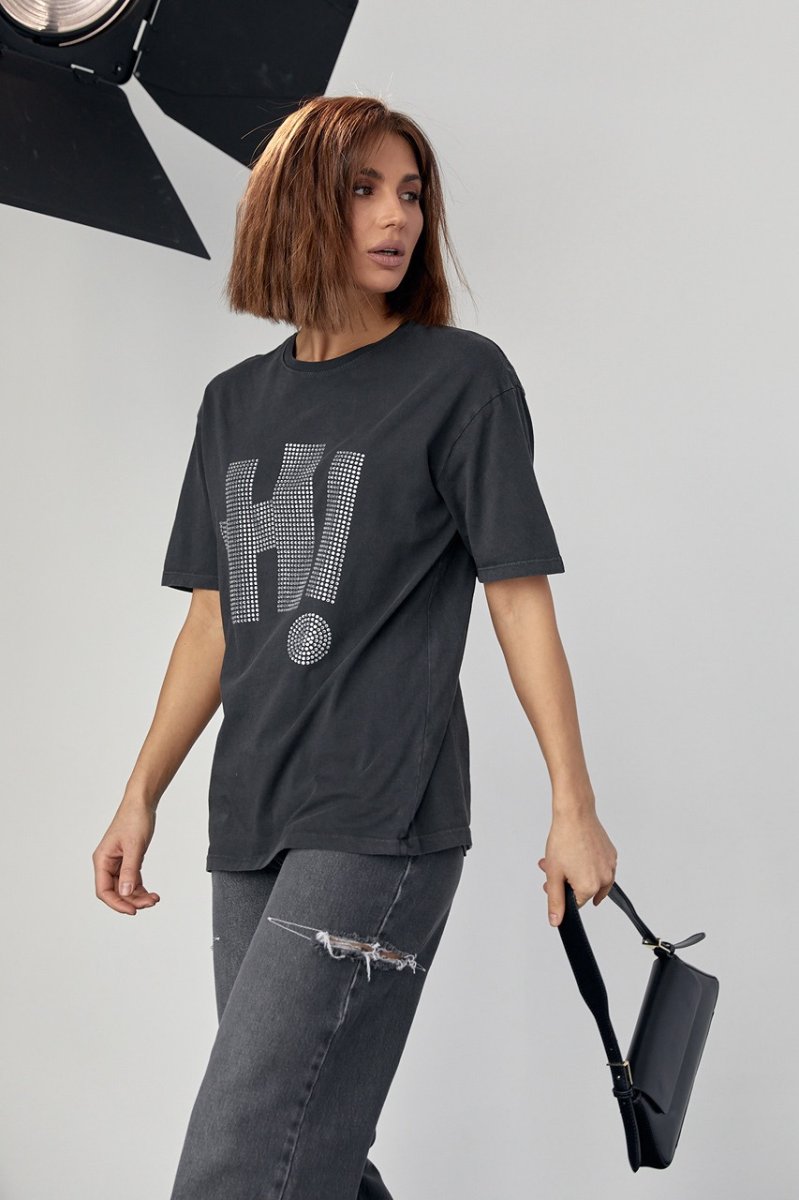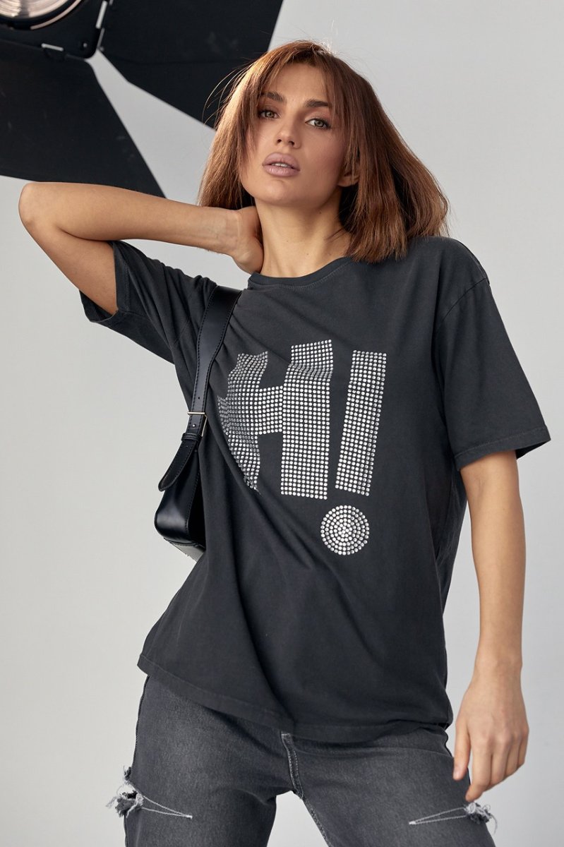Модель прямого крою спереду прикрашена написом "Hi!" із великих термостраз. Низ у виробі прямий, класичні рукави короткі, лінія плеча злегка подовжена. Кругла горловина обшита окантовкою в тон.
