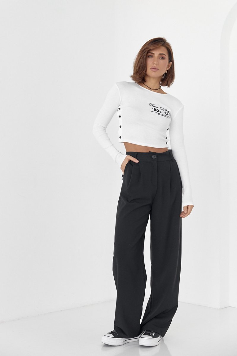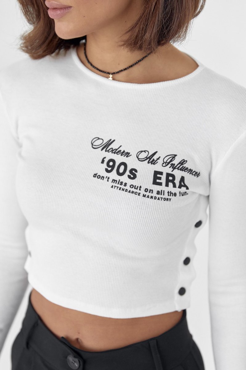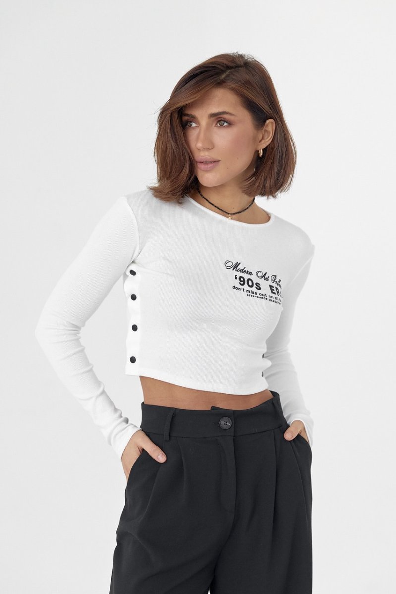 Модель виконана із щільного трикотажу у дрібний рубчик, з довгими рукавами та прямим низом. Кругла горловина обшита окантовкою і спереду, на грудях, кофточка прикрашена буквеним принтом. Бічні шви у виробі застібаються на кнопки.
