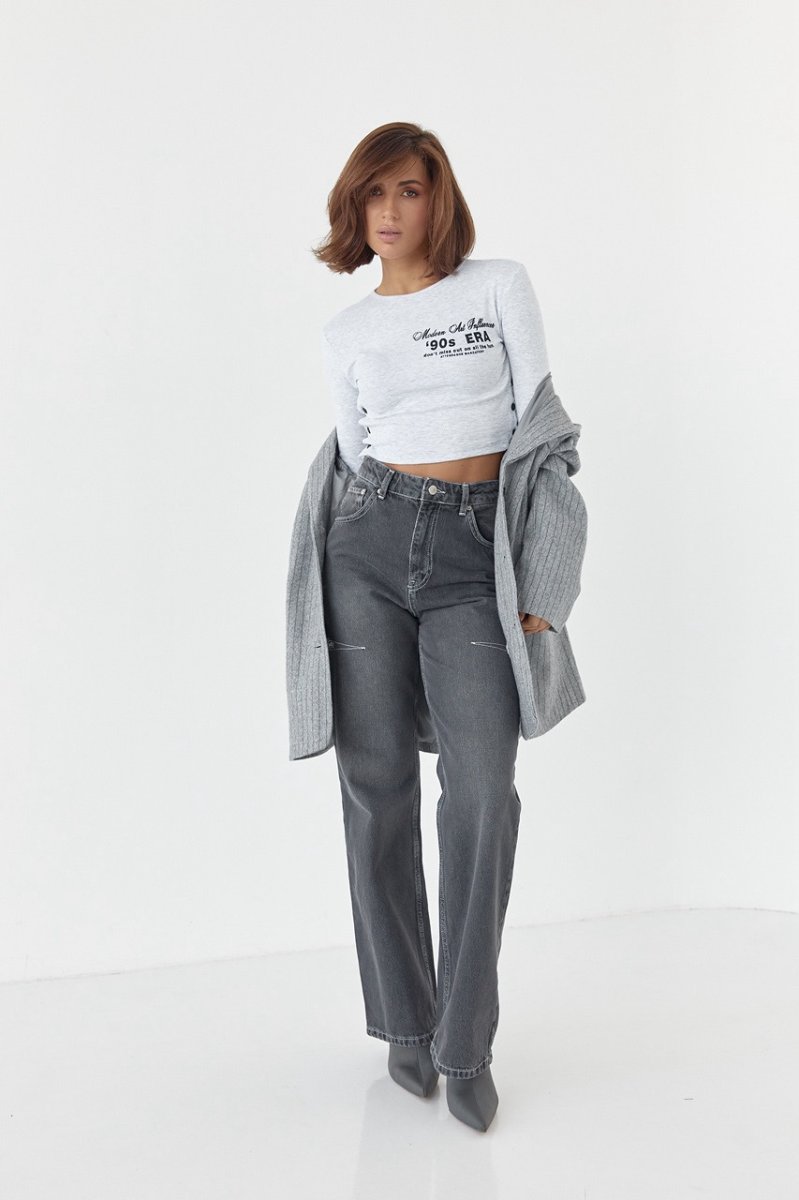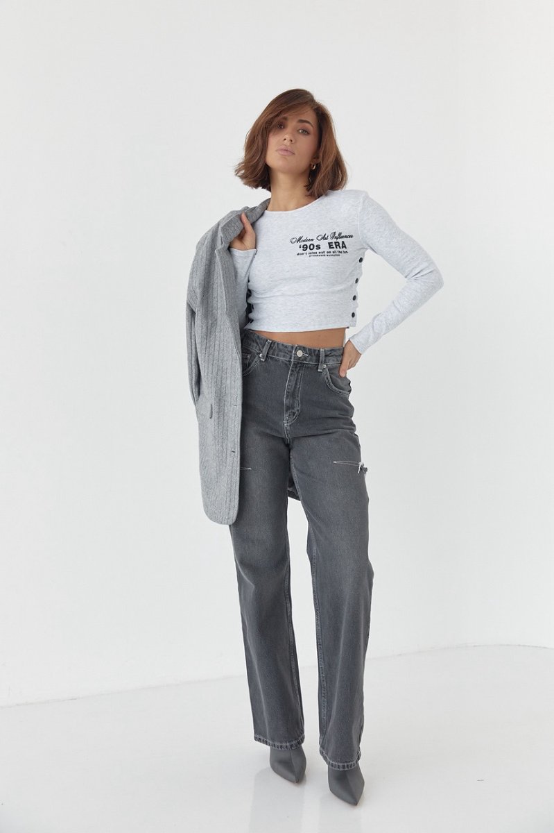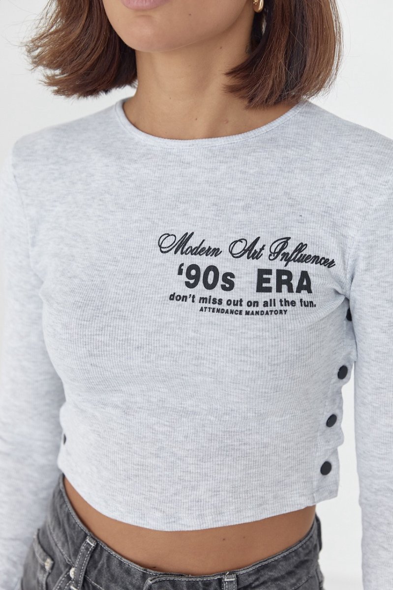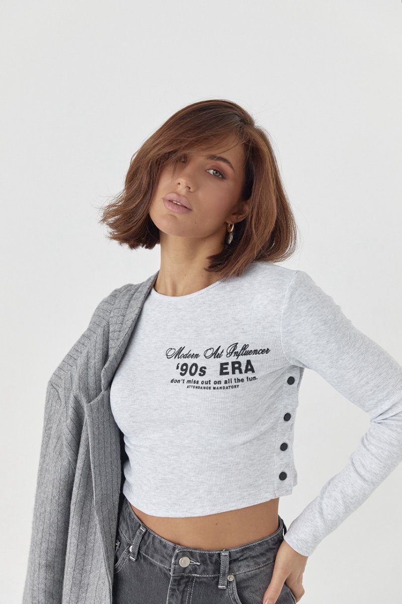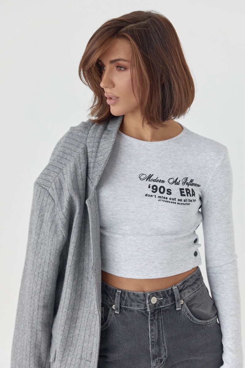 Модель виконана із щільного трикотажу у дрібний рубчик, з довгими рукавами та прямим низом. Кругла горловина обшита окантовкою і спереду, на грудях, кофточка прикрашена буквеним принтом. Бічні шви у виробі застібаються на кнопки.