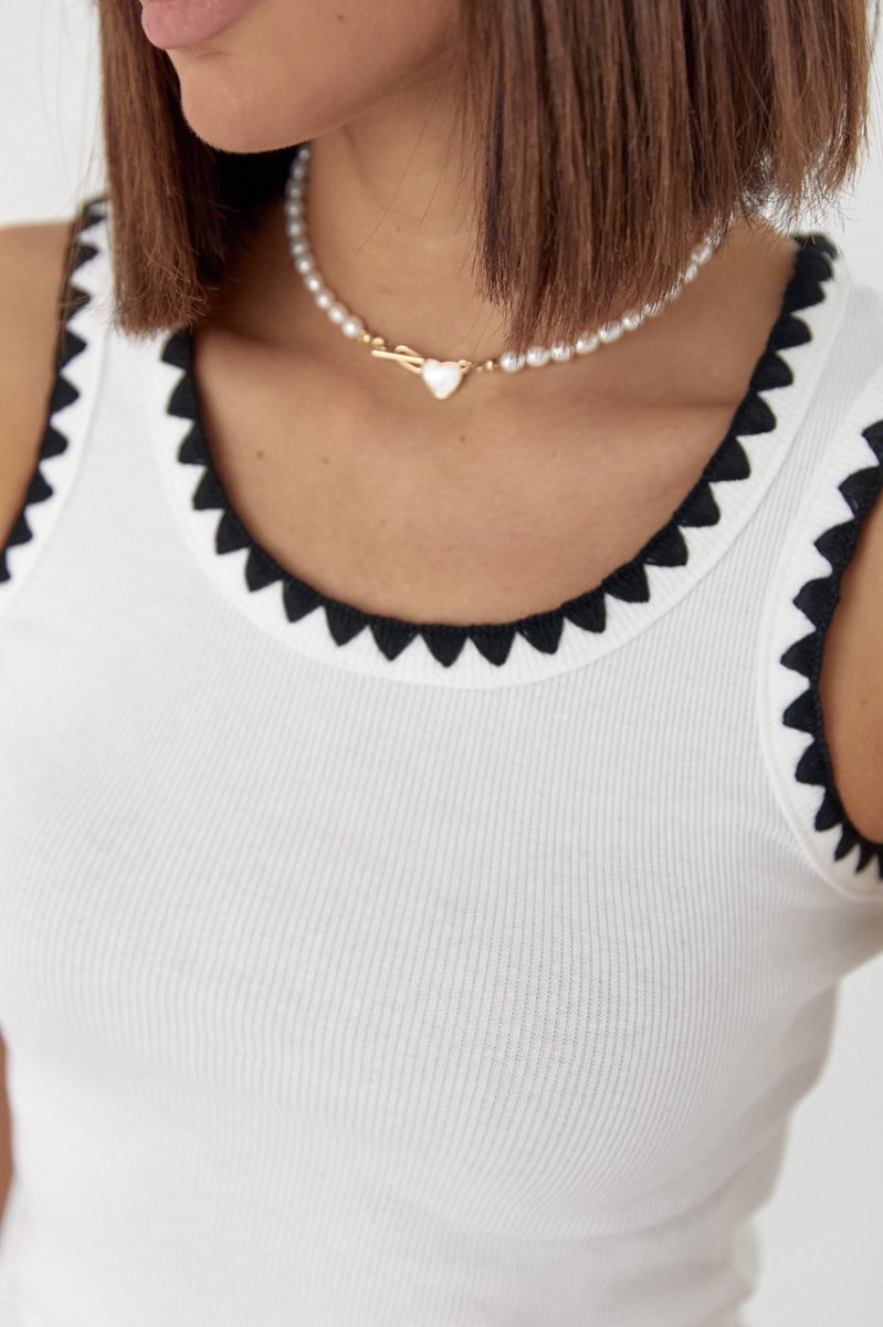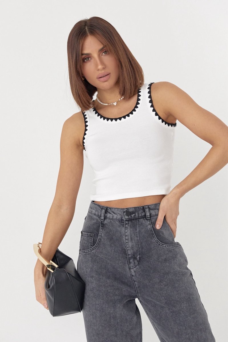 Пройми рукавів та горловина майки оброблені широкою окантовкою з основної тканини та доповнені вишивкою контрастного кольору за типом зигзаг.