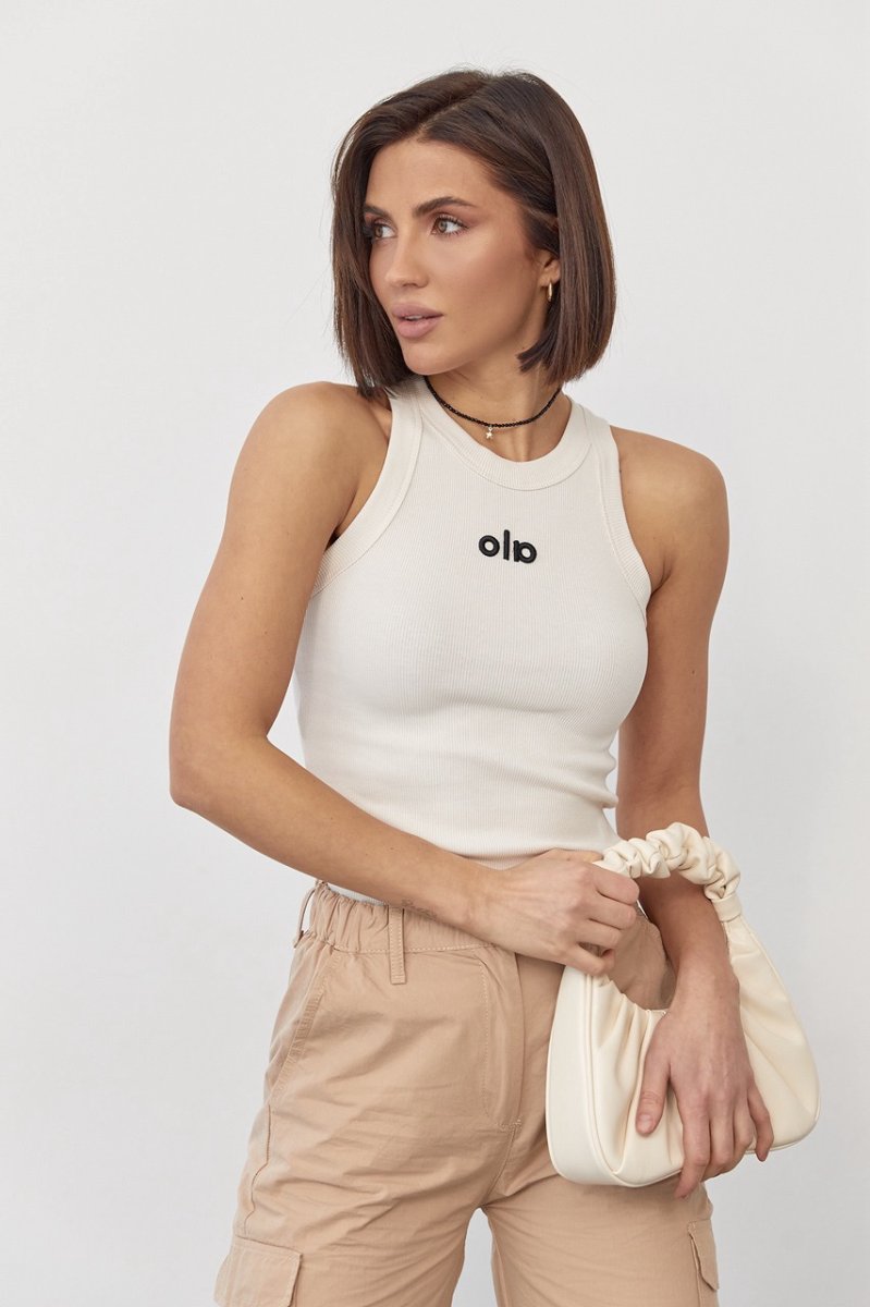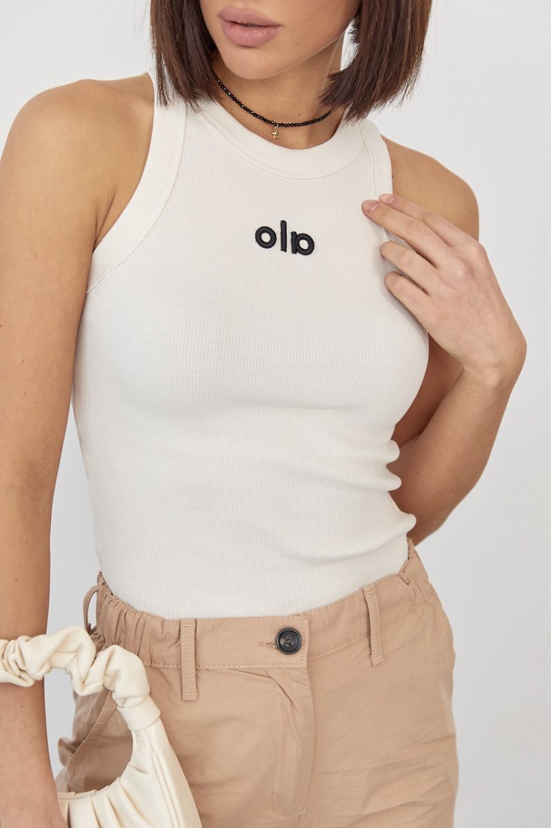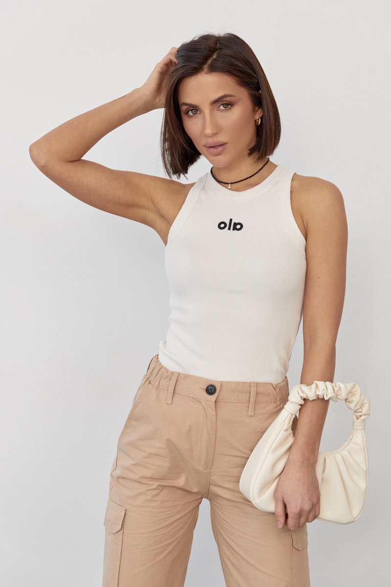 Пройми рукавів та горловина майки оброблені широкою окантовкою з основної тканини. На поличці присутній вишитий напис "Ola" чорного кольору.