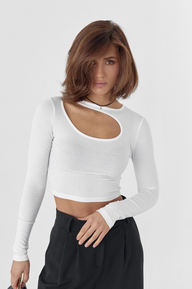 Трикотажний джемпер у рубчик з краплеподібним вирізом - 8762 молочний