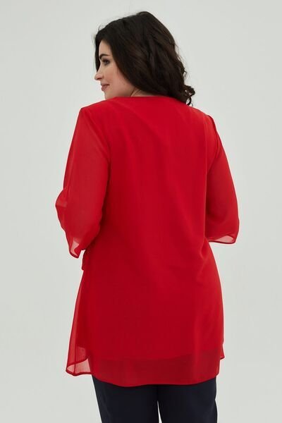 Туніка трапецієподібного крою з шифону, підкладка виконана з трикотажу. Розтяжність тканини низька. Родзинка моделі – відлітна накладка по полці з гіпюру.