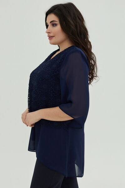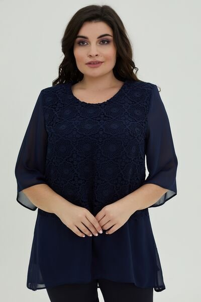 Туніка трапецієподібного крою з шифону, підкладка виконана з трикотажу. Розтяжність тканини низька. Родзинка моделі – відлітна накладка по полці з гіпюру.