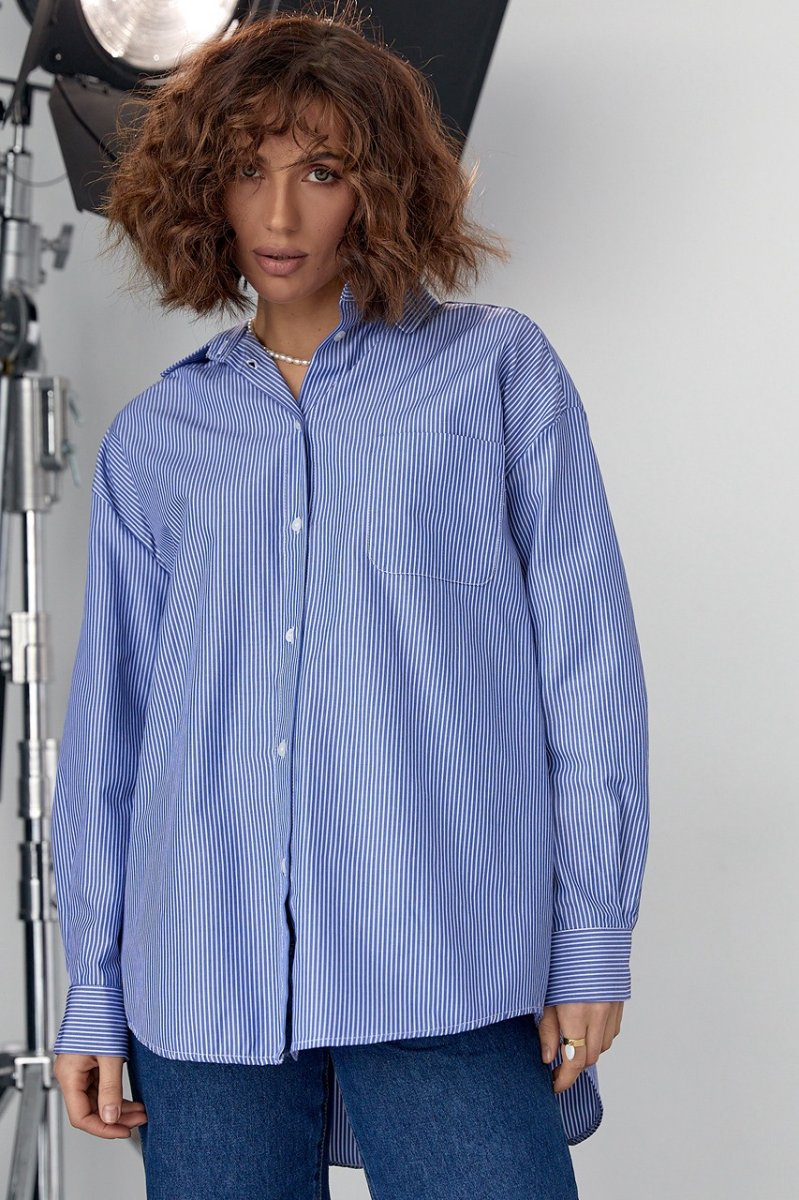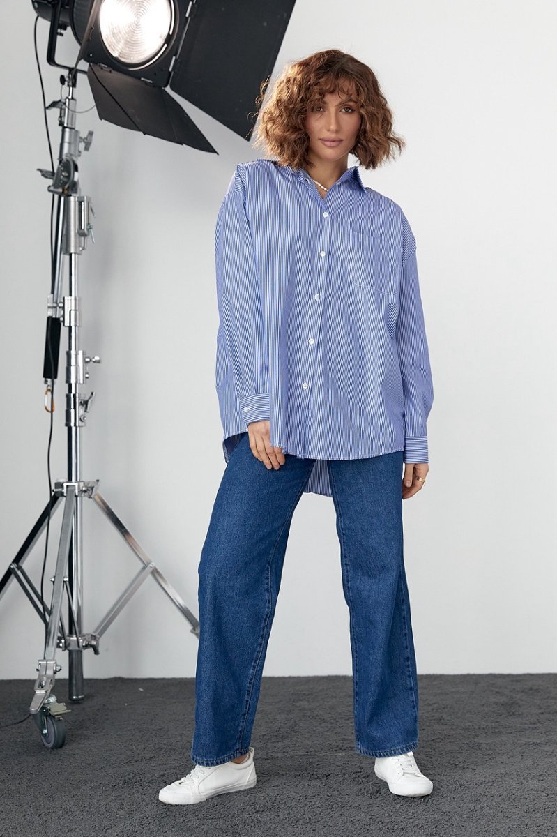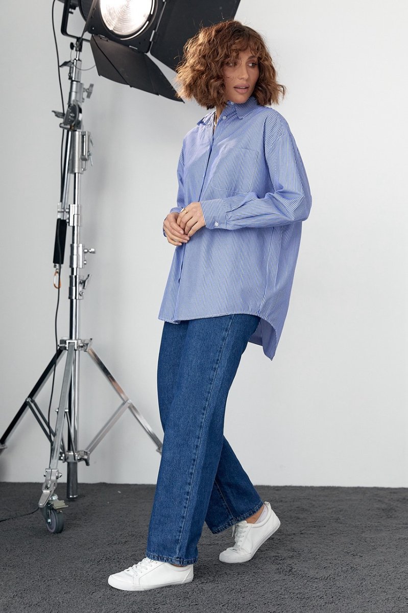 Модель у стилі оверсайз повністю прикрашена тонкою вертикальною смужкою, а манжети довгих рукавів та відкладний комір на стійці йдуть із горизонтальним розташуванням смужки. Сорочка спереду та манжети застібаються на гудзики, плечі у виробі подовжені, низ напівкруглий.