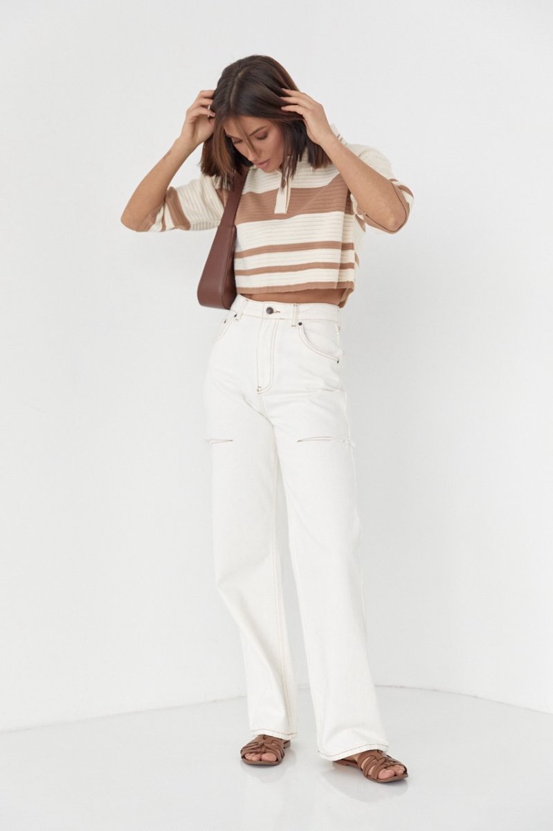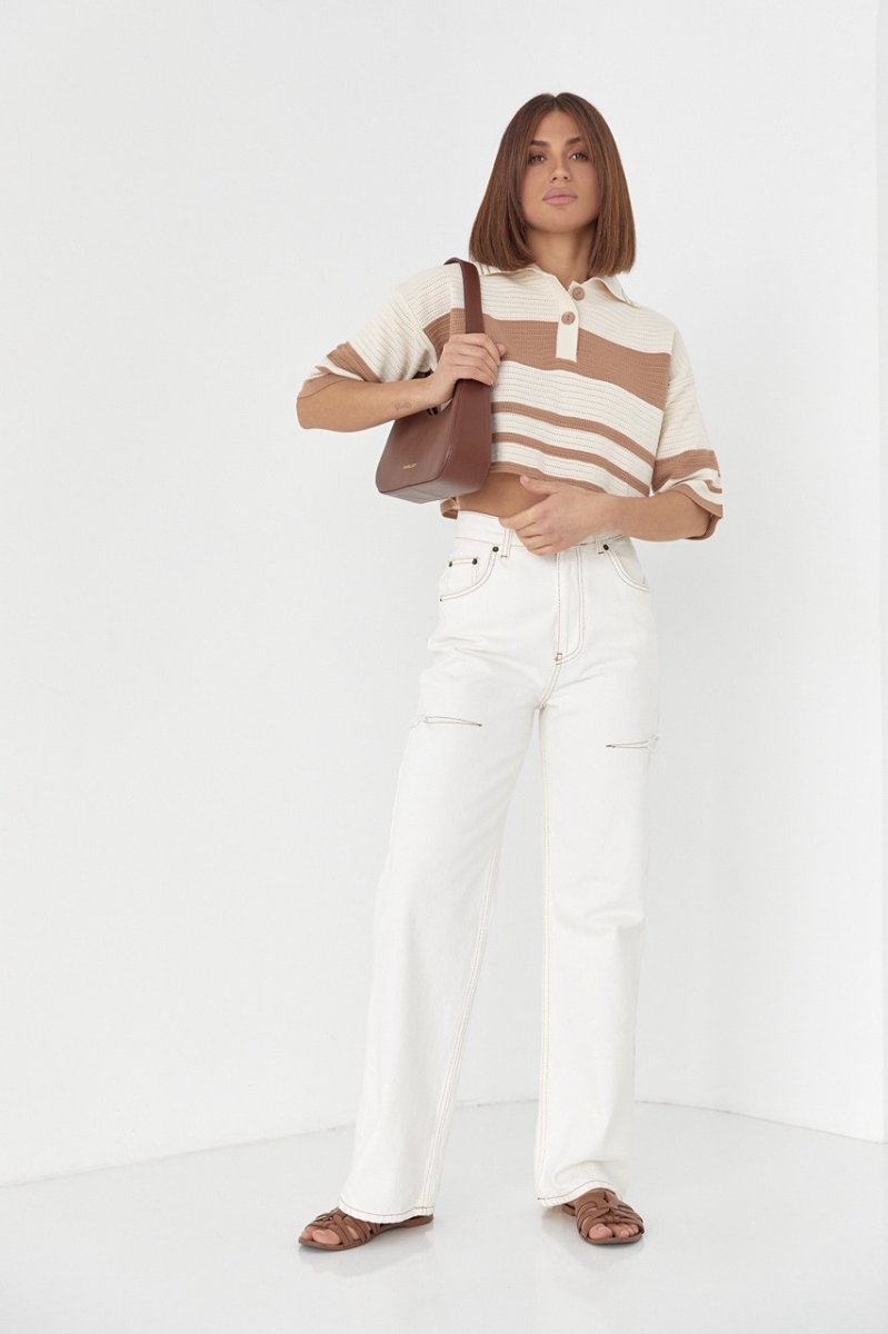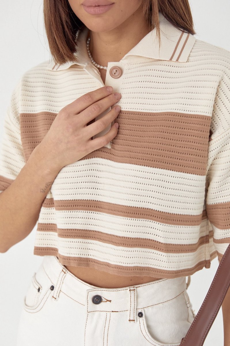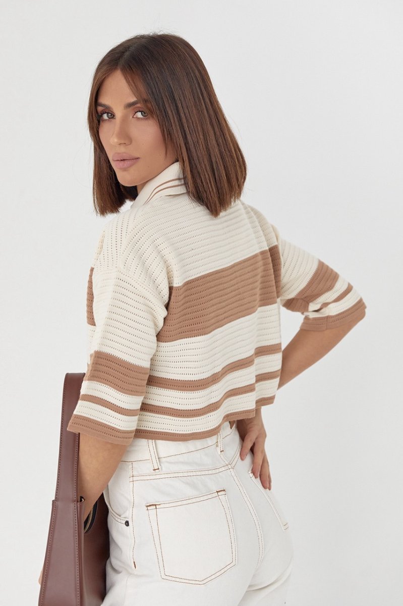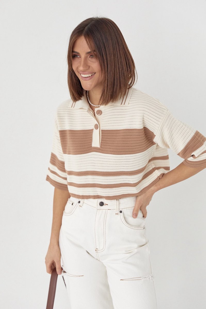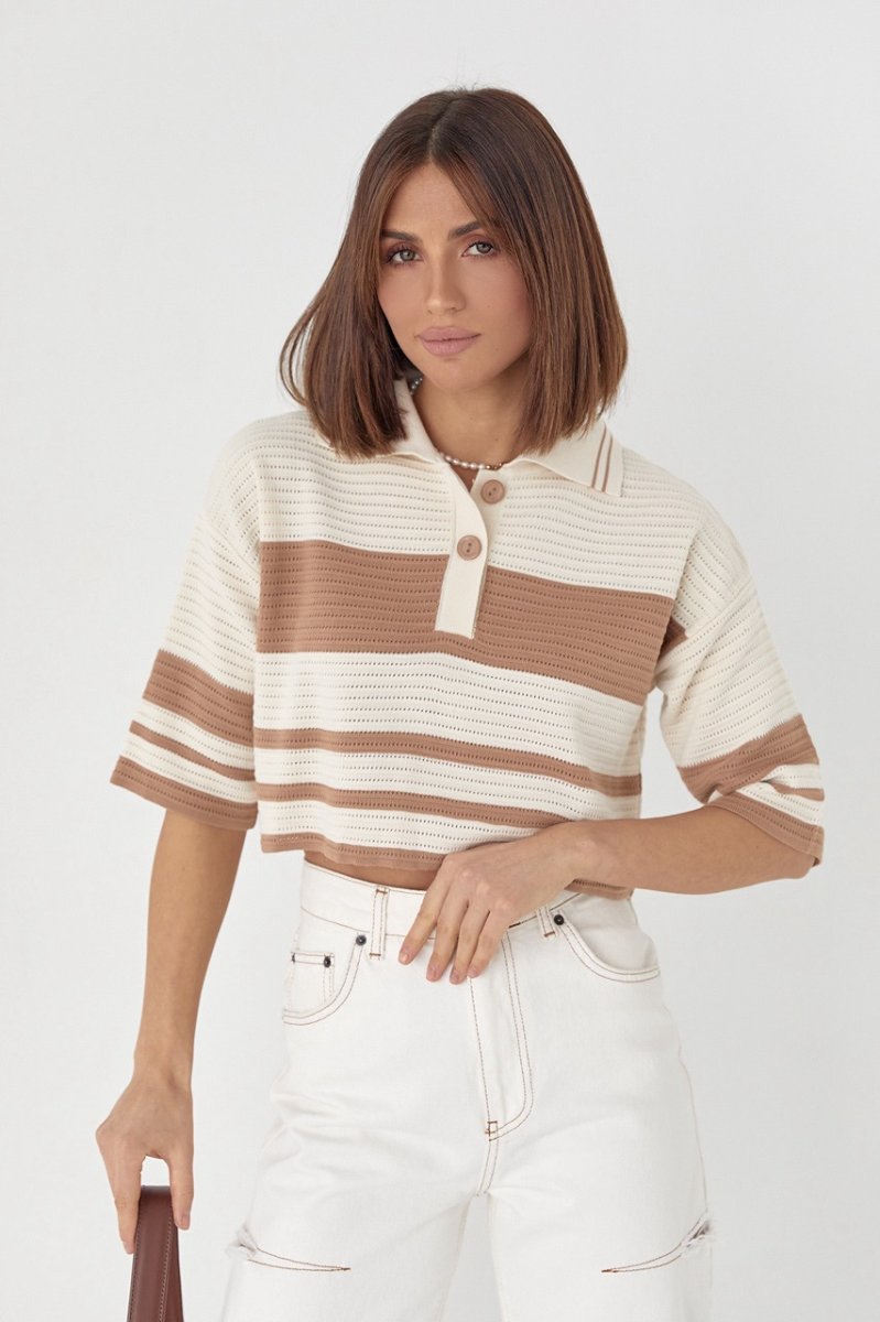 З такою вкороченою oversize футболкою жіночою ти можеш поєднувати і трикотажні стильні спідниці різних фасонів, і літні шорти, і улюблені джинси. Її трендовий фасон подарує тобі комфорт, а візерунок у горизонтальну кольорову смужку стане основним акцентом кожного образу.