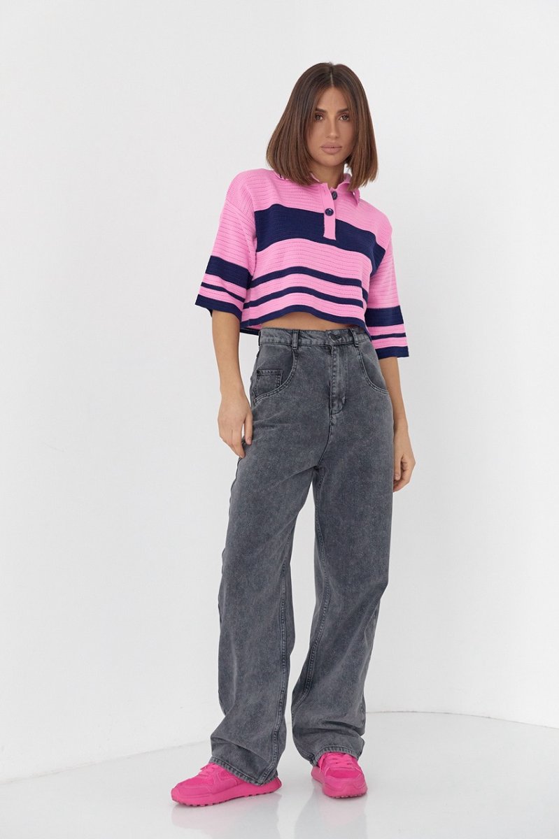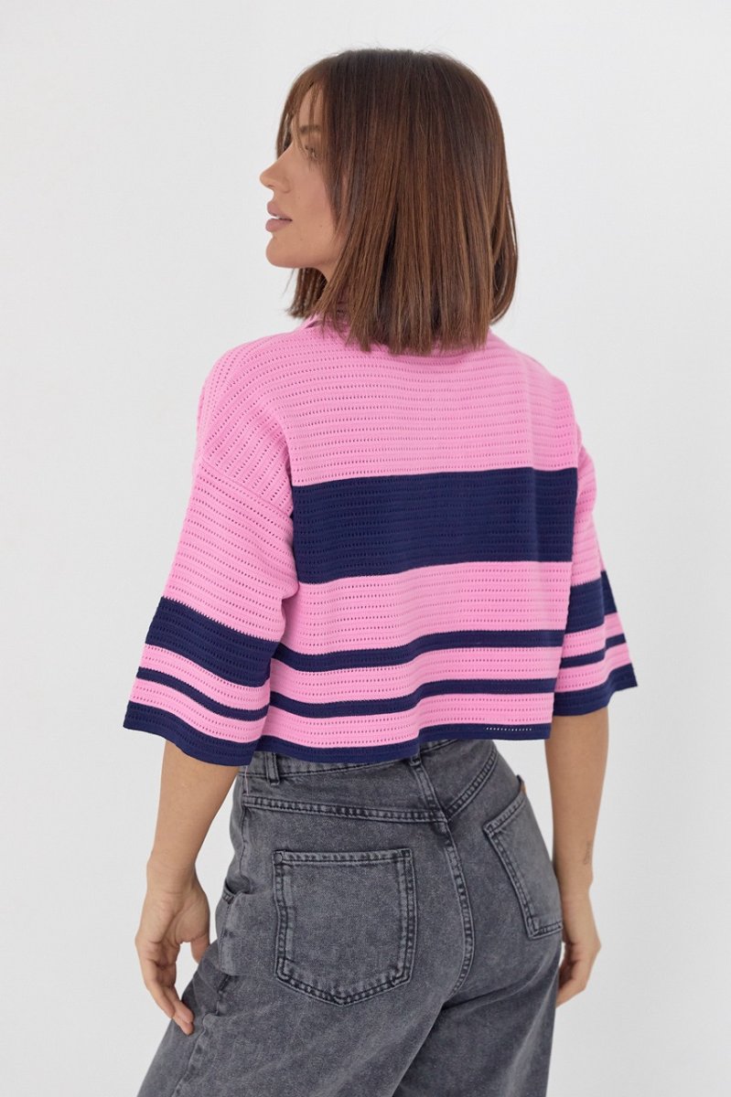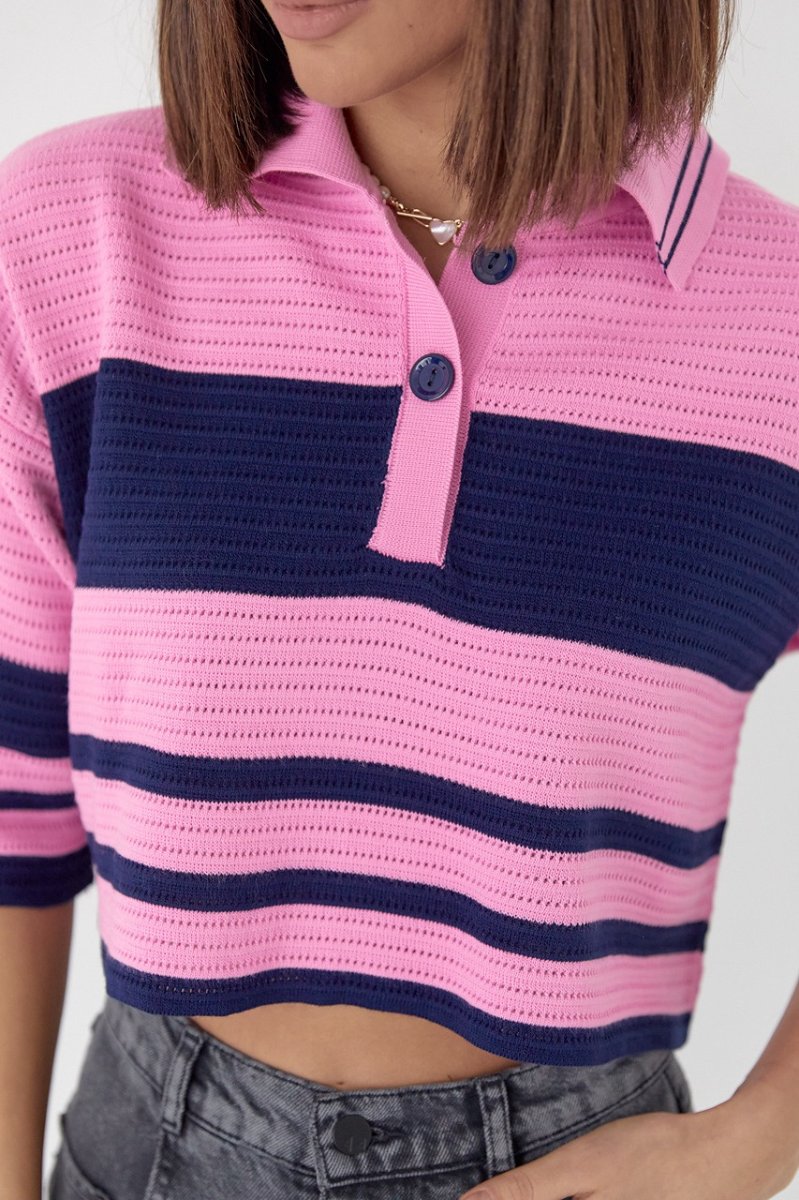 Укорочена ажурна футболка поло в смужку - 6804 фуксія