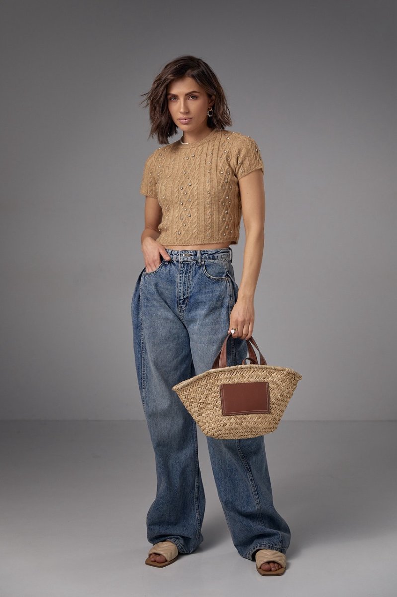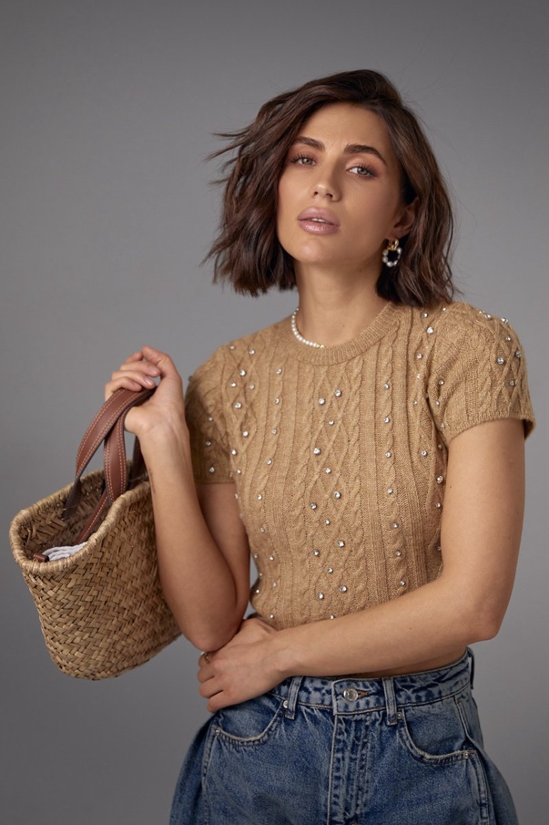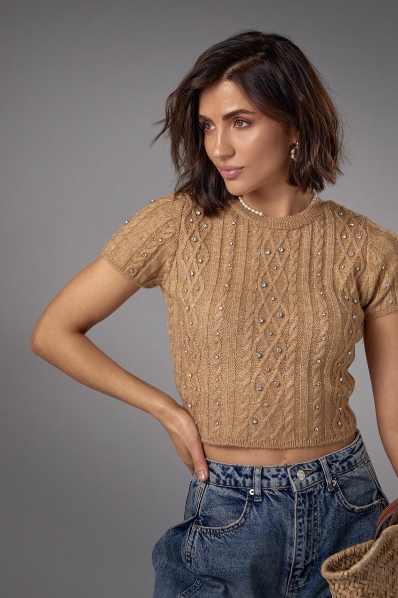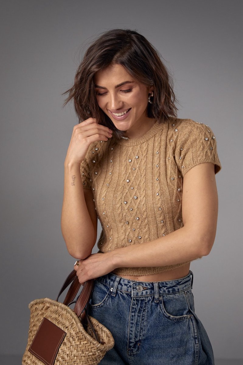 Вона виконана з м'якої пряжі з візерунком у вигляді косичок, які надають виробу неперевершеного вигляду. Футболка має короткі рукави та вкорочену довжину, що підкреслює талію.