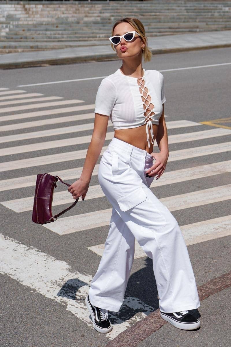 Укорочений топ зі шнуровкою по груді силуету, що облягає, - ідеальний вибір для створення сучасного і стильного образу. Виконаний з м'якого трикотажу в рубчик , який приємний на дотик та забезпечує комфортну посадку. Ця модель відмінно підходить для поєднання з джинсами або спідницею та стане незамінною річчю у гардеробі кожної модниці. Її можна поєднувати з жакетами , куртками та сорочками.