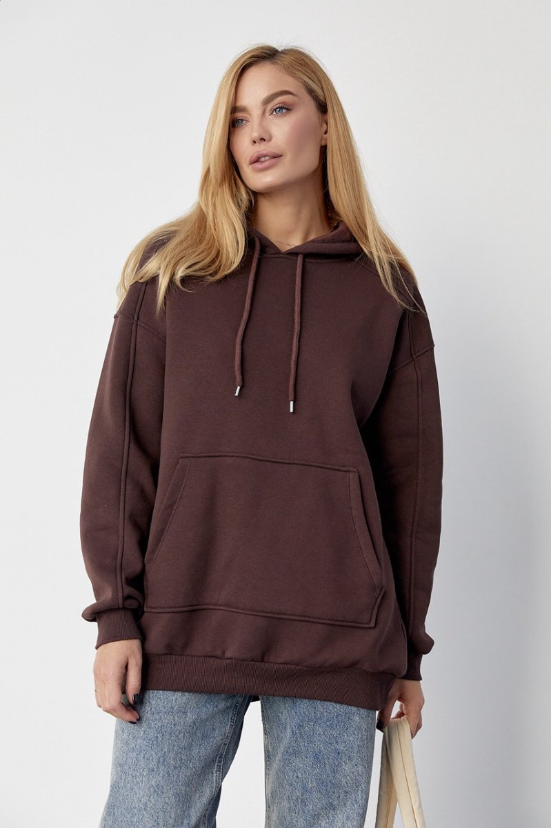 Ця модель з начосом виконана в стилі оверсайз з опущеною лінією плеча. Довгі рукави та прямий низ обшиті манжетами з рибани, а великий капюшон зав'язується на шнурок. Спереду на кофті внизу пришита велика кишеня-кенгуру.