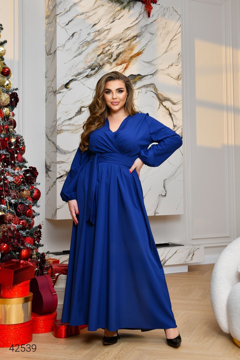 Вечірня сукня на запах. Сукня у вечірньому стилі із софту (розтяжності немає). Ліф сукні виконаний на запах, рукав втачний, низ рукава та талія на резинці. Пояс із основної тканини в комплекті.