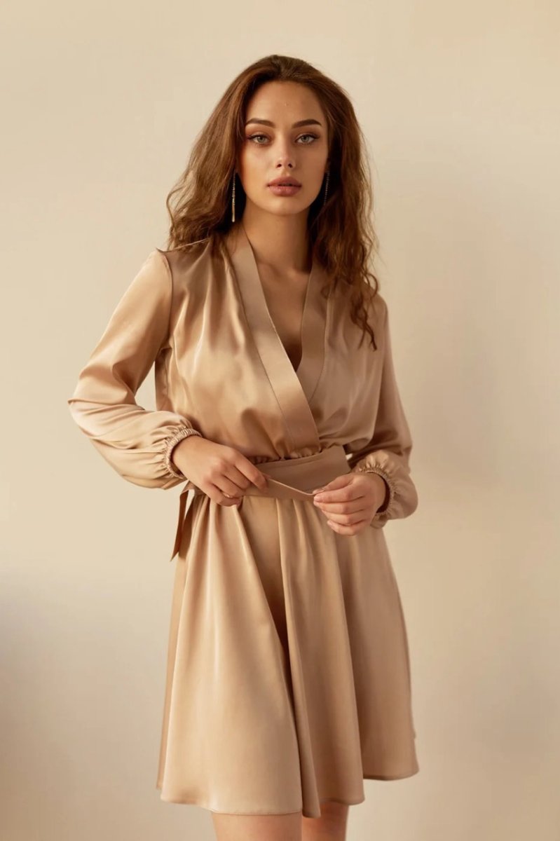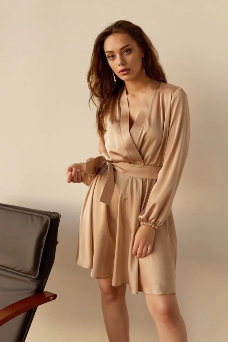 Повітряна сукня у ніжному кольорі йде на запах. Талія підвищена, спідниця пишна, розкльошена. Горловина має V-подібний виріз. Рукав довгий, пишний. Пояс знімний.