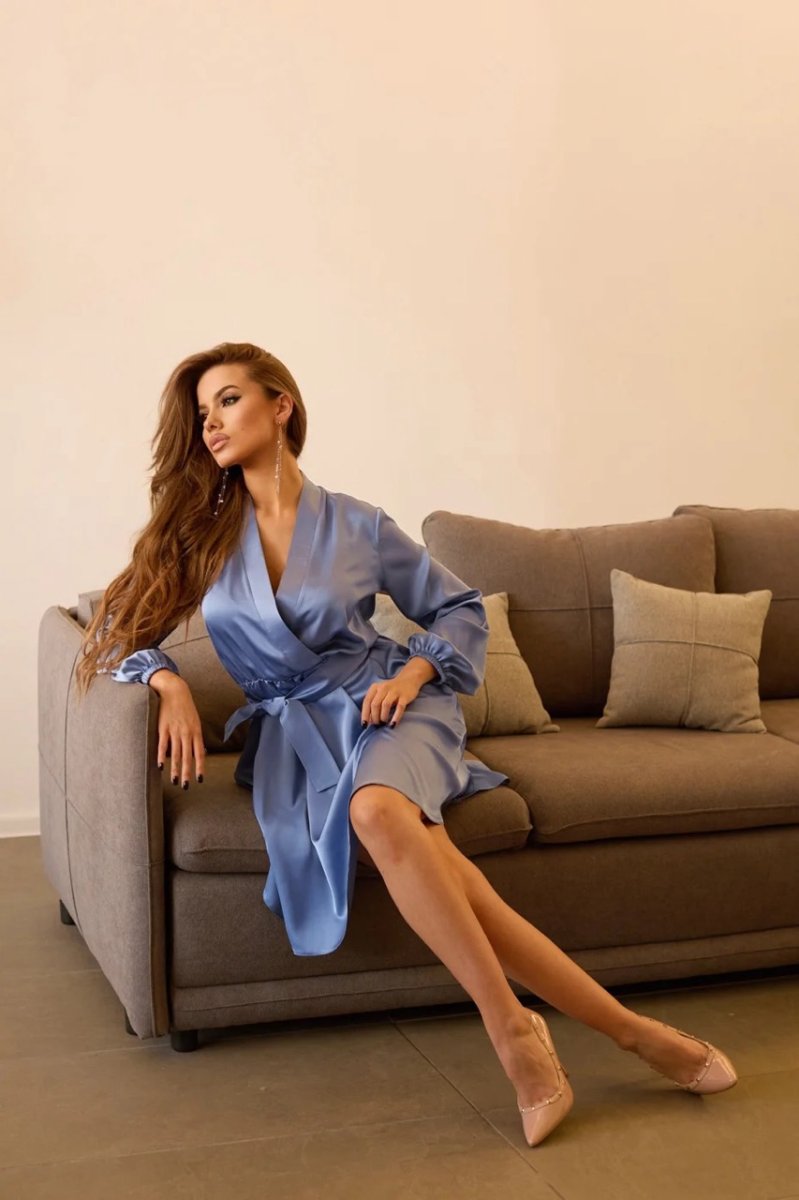 Повітряна сукня у ніжному кольорі йде на запах. Талія підвищена, спідниця пишна, розкльошена. Горловина має V-подібний виріз. Рукав довгий, пишний. Пояс знімний.