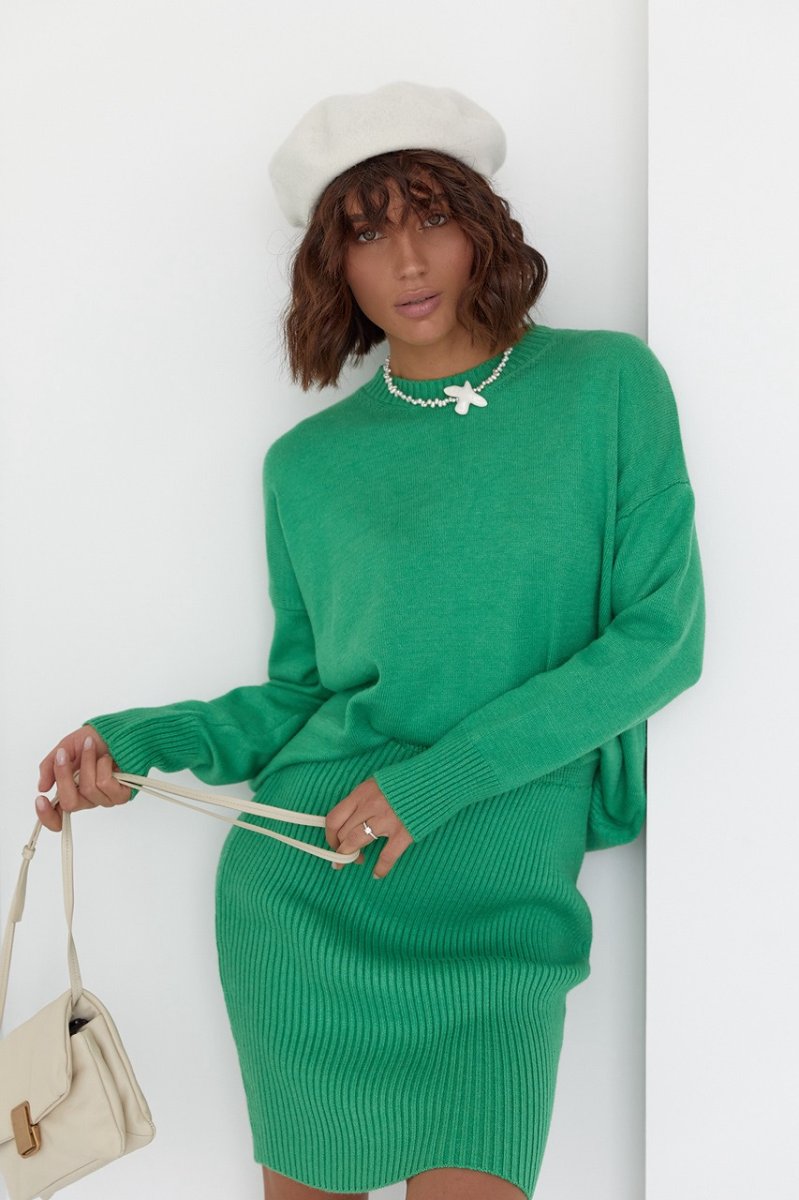 Модель зшита з теплої та дуже приємної до тіла пряжі. У спідниці прямий низ та широка резинка в поясі. Завдяки рубчистій текстурі тканини, спідниця відмінно тримає форму і видовжує силует. Джемпер в стилі оверсайз, довгі рукави, пройми опущені. Краї низу фігурні, горловина доповнена коміром із тканини, складеної вдвоє.