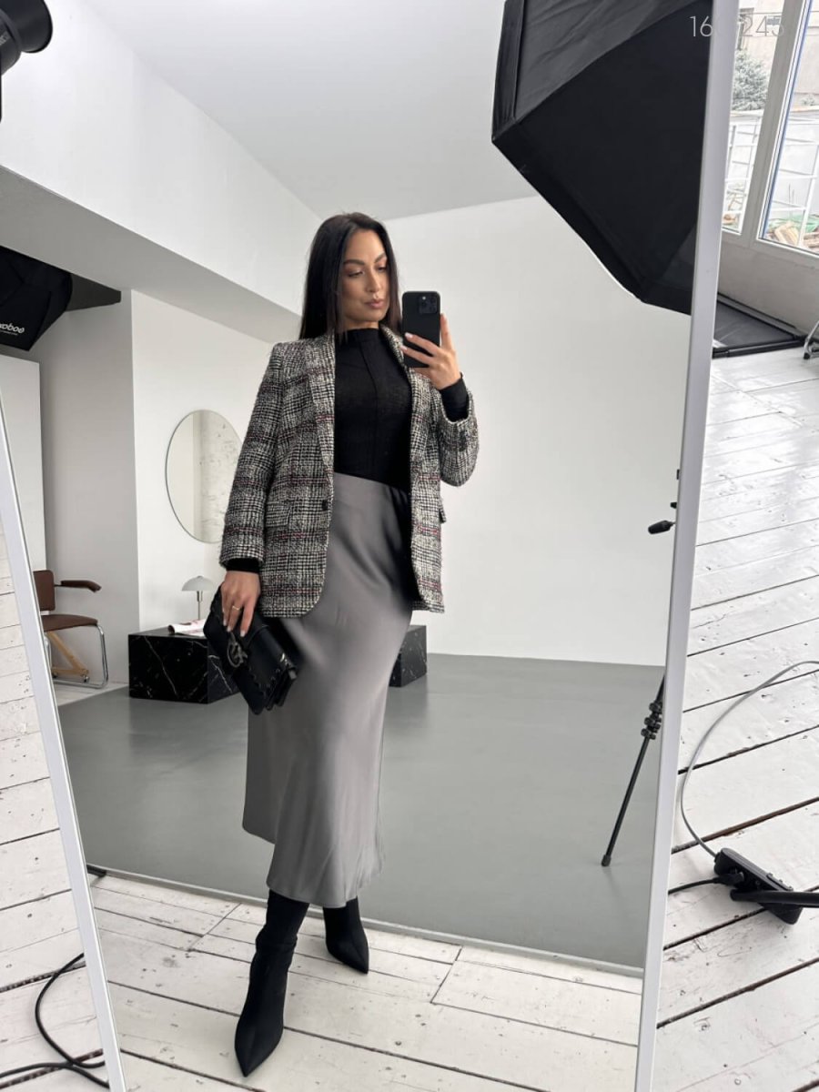 Деталі: спідниця покроєна по косій, за рахунок чого набуває форми тіла, з поясом на гумці, без кишень.