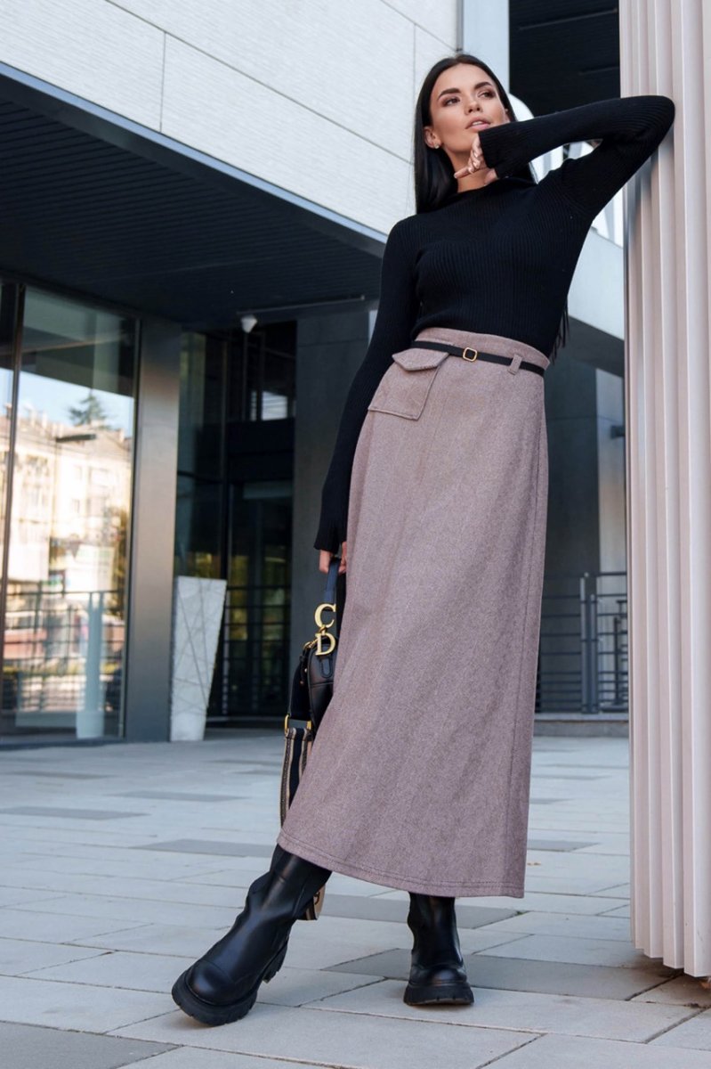 Тепла міді-спідниця А-силуету із щільної тканини - знахідка для осіннього та зимового гардеробу. Лаконічний стиль буде доречний і зі світлою сорочкою або жакетом, і з контрастною водолазкою. А універсальна довжина спідниці дозволяє носити її з різним взуттям. Враховуючи нейтральне забарвлення, таку спідницю легко можна вписати в офісний гардероб.