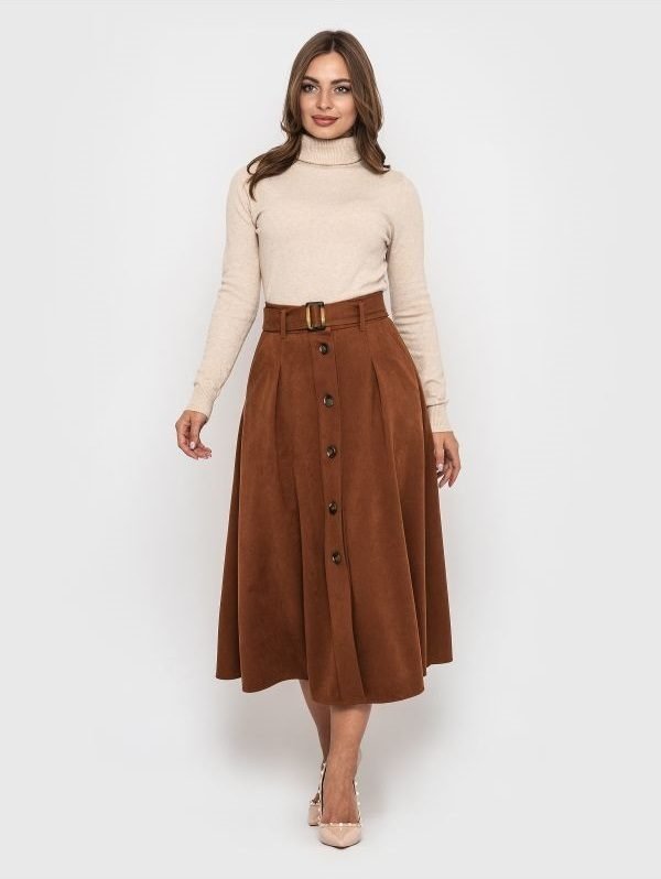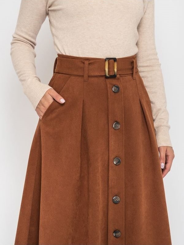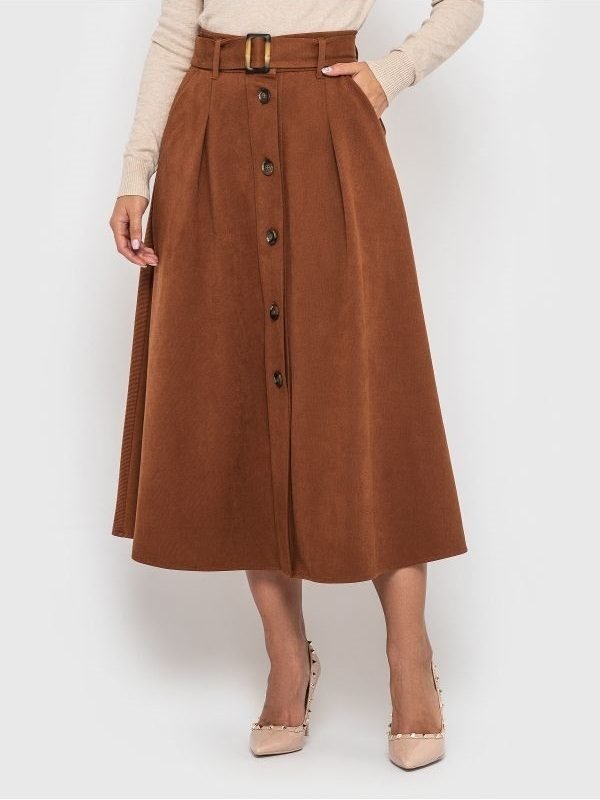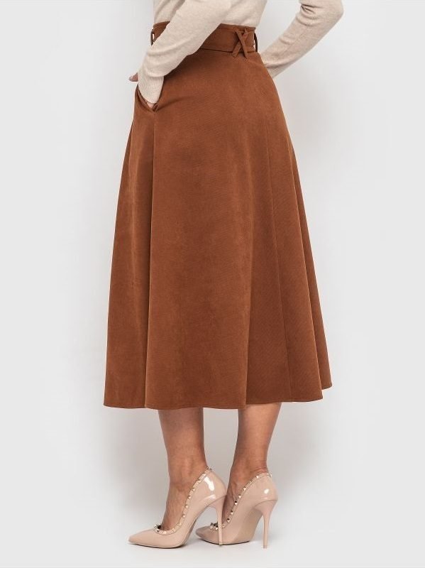 Спідниця-полусолнце відмінно підходить для прохолодної пори року. Модель на підкладці, застібається по переду на гудзики. Широкий притачной пояс, по боках кишені. У комплект входить тканинний пояс з пряжкою.