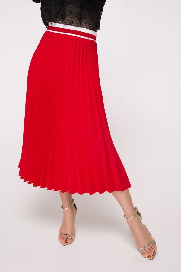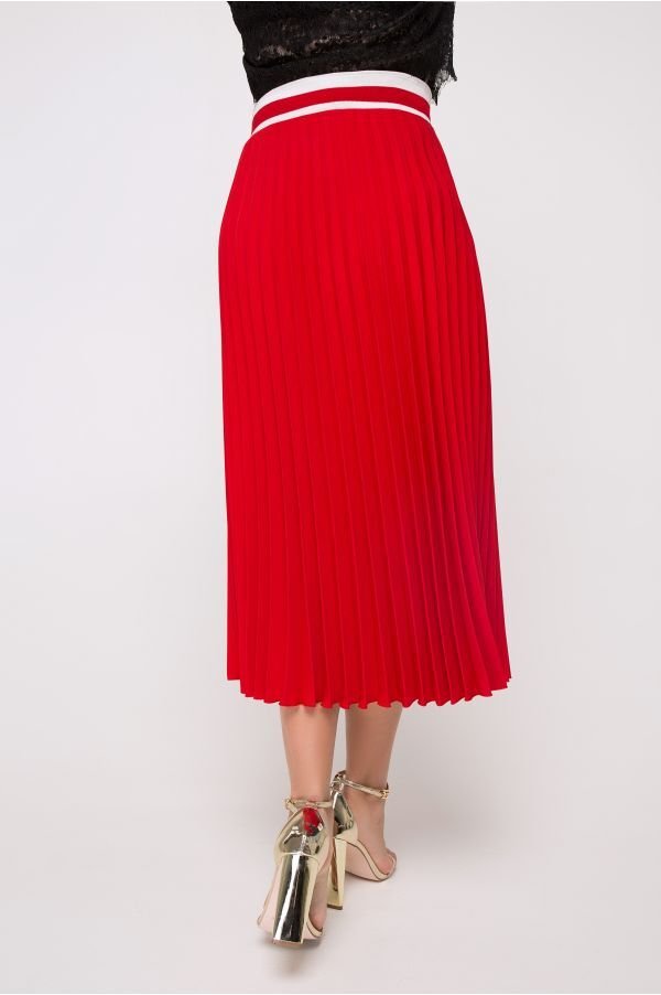 Плісирована спідниця-полусолнце виконана в довжині міді. Модель оформлена еластичним широким поясом з довяза, що дозволяє самостійно регулювати висоту посадки.
