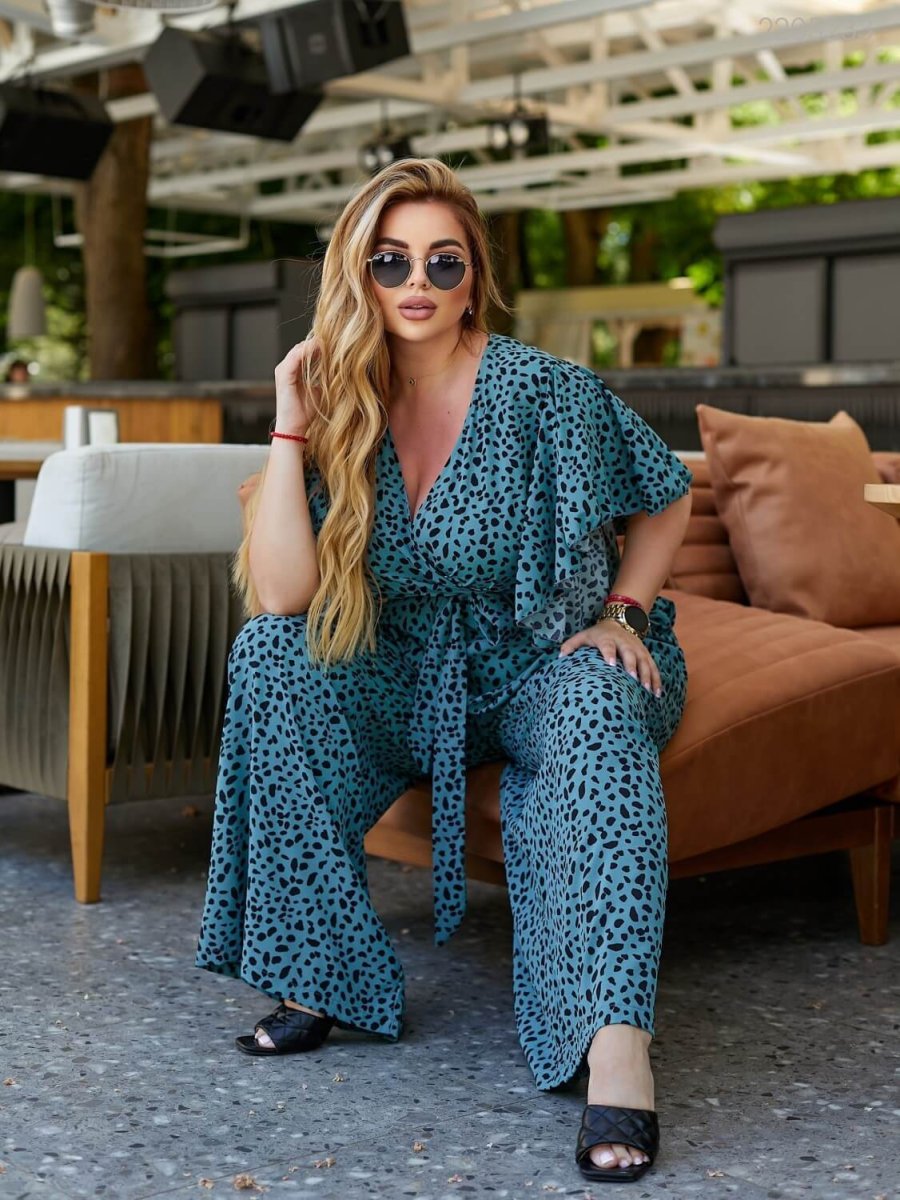 Деталі: А-силует, пишний рукав, глибоке декольте, відрізна талія, штани-палаццо вільного крою з кишенями, застібка - таємна блискавка по спинці. До комбінезону додається пояс.
