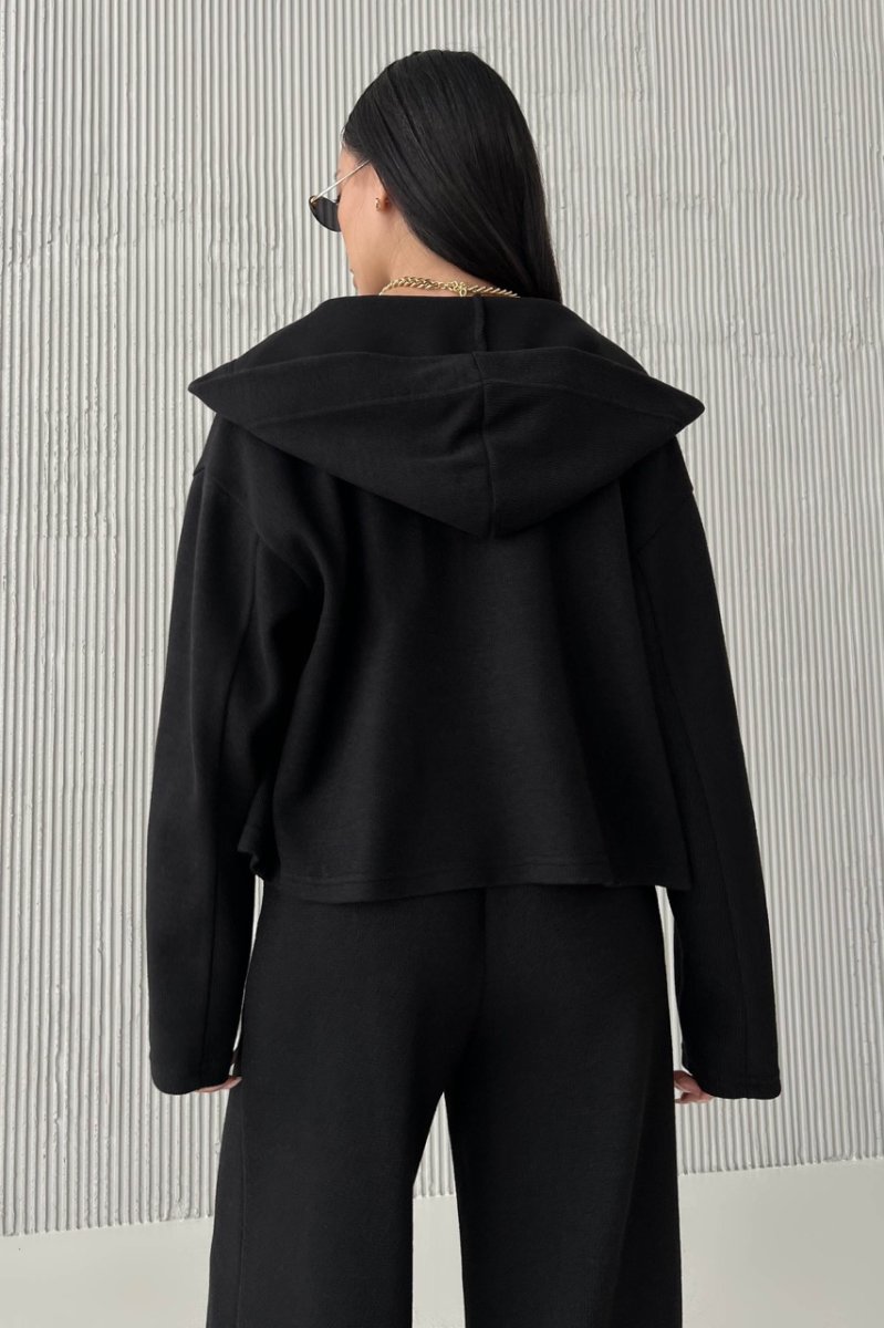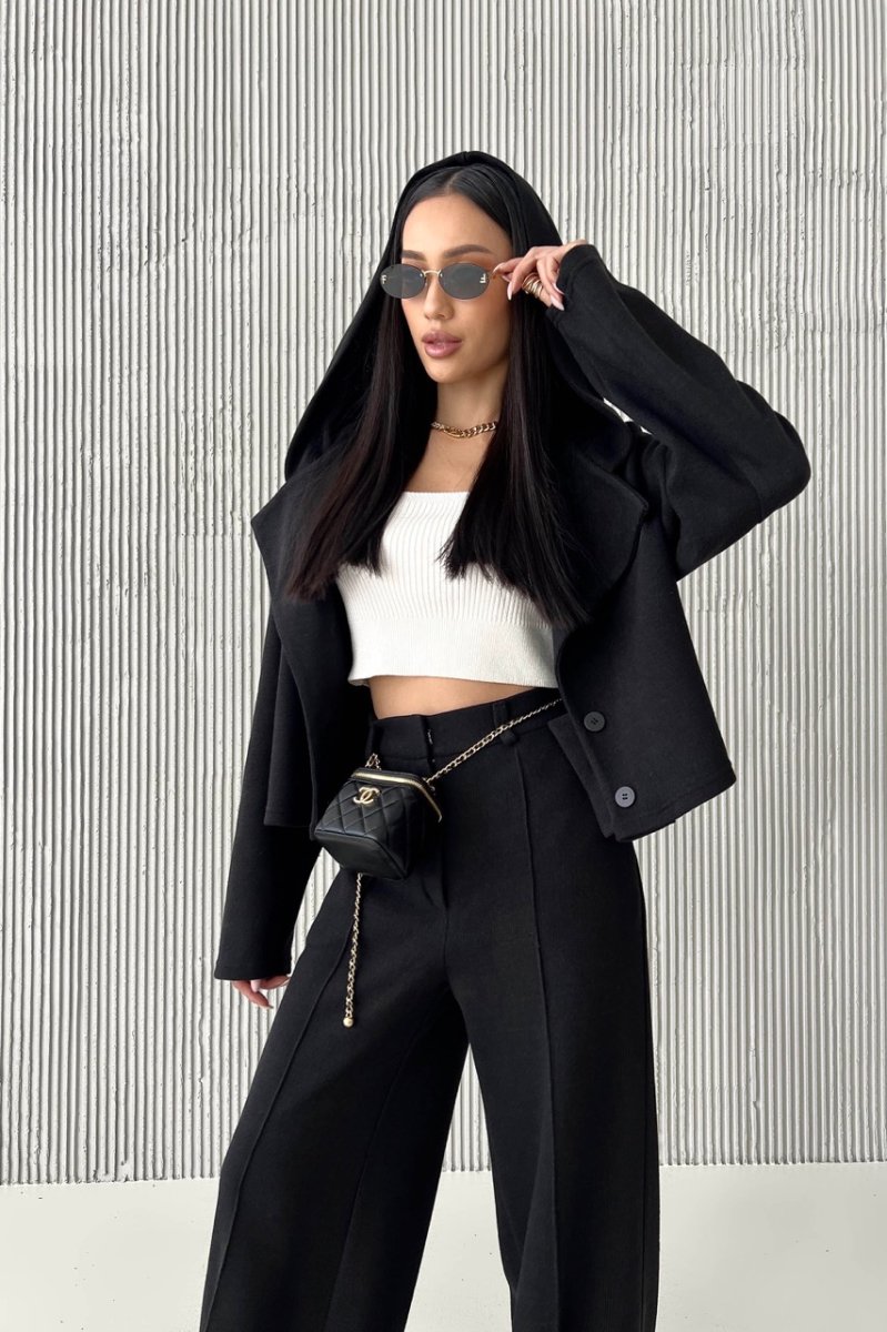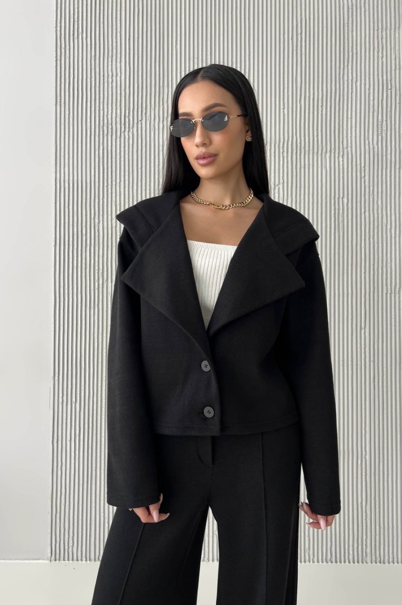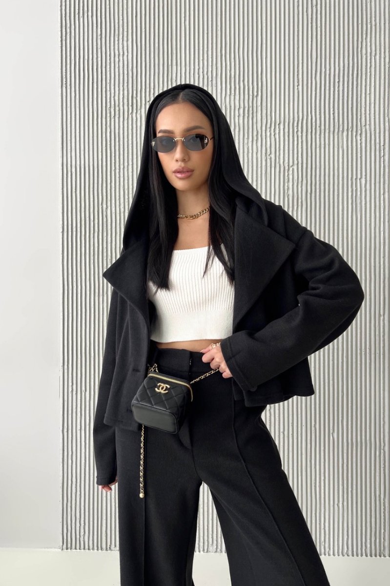 Жакет однобортний вільного крою, з капюшоном. Довгий рукав зі спушеним плечем. Відкладний комір з гострими лацканами переходить у капюшон. Застібається на ґудзики, на внутрішній частині жакета - з’ємна діталь під ґудзики.