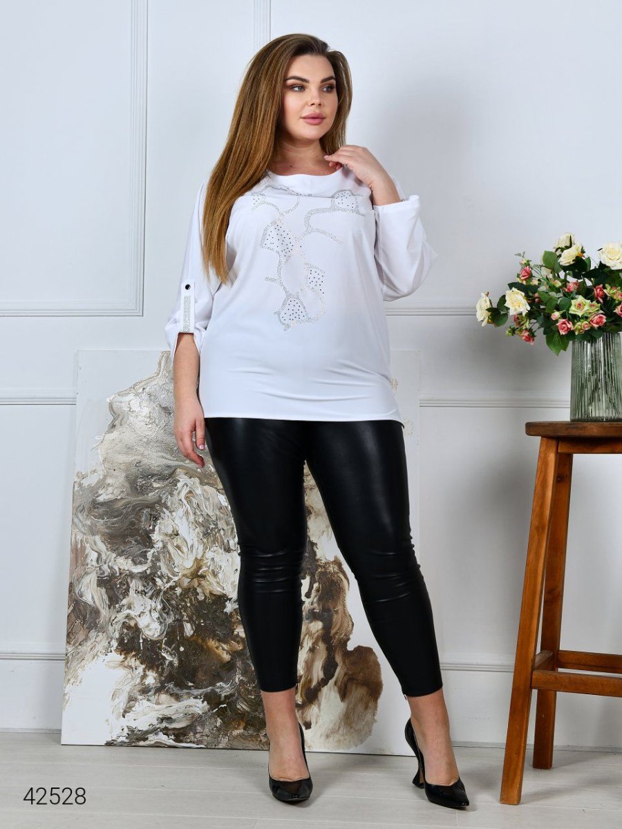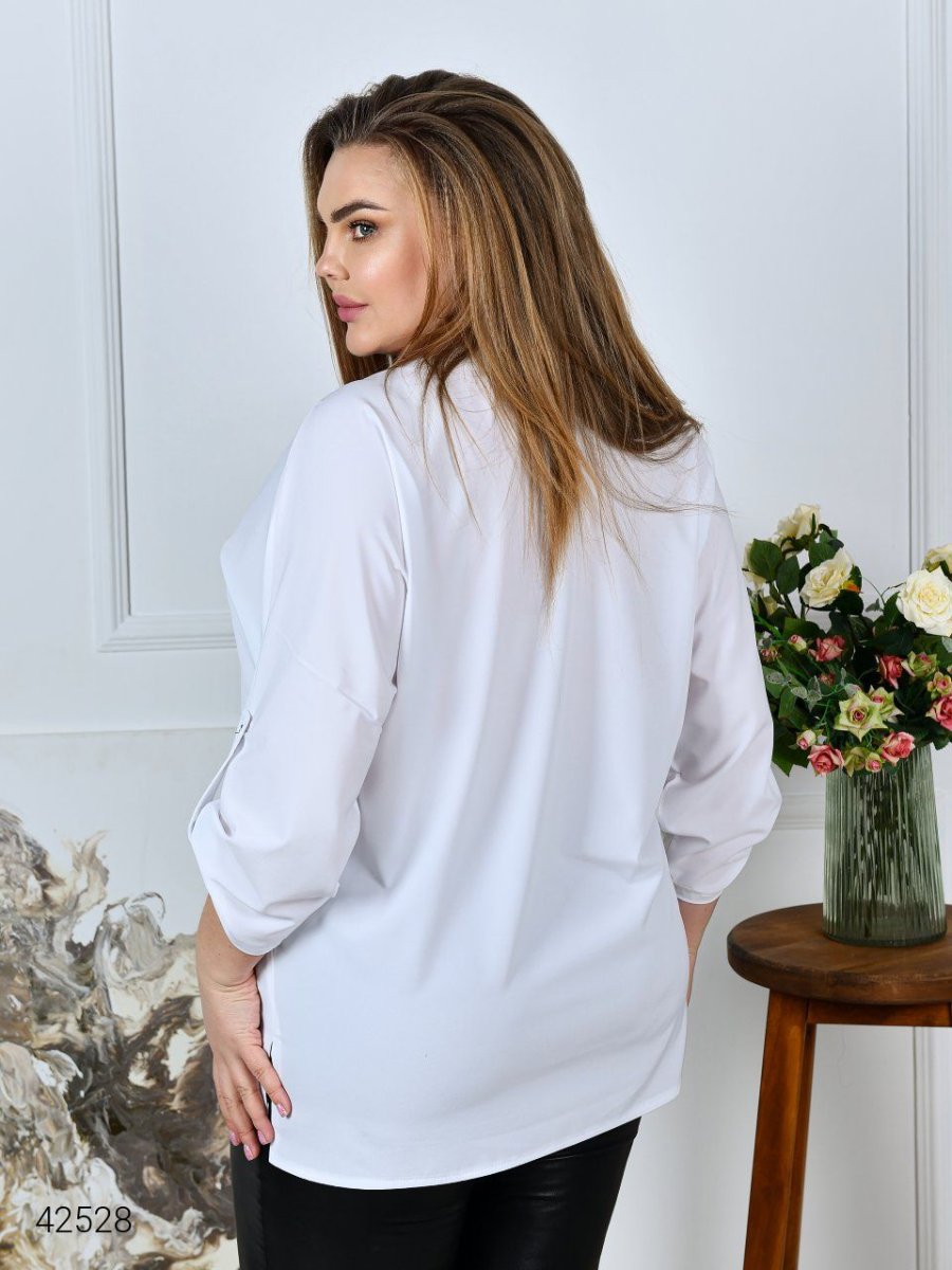 Жіноча блузка вільного крою. Жіноча блузка вільного крою. Силует блузки вільний. Горловина кругла. Рукав прямий, коротшає за допомогою спеціальної деталі на гудзику. Низ асиметричний, спереду трохи коротший, з обох боків невеликі розрізи. Блуза декорована аплікацією з якісних страз.