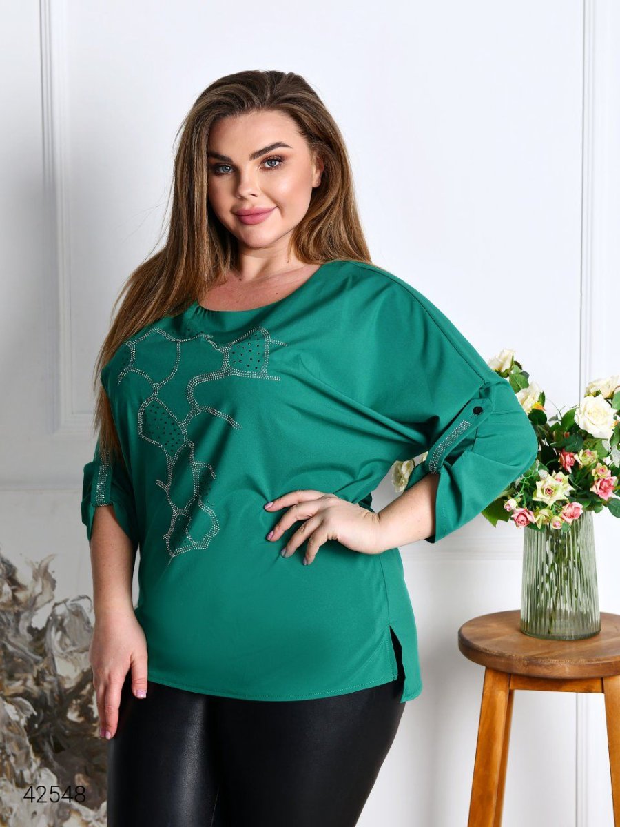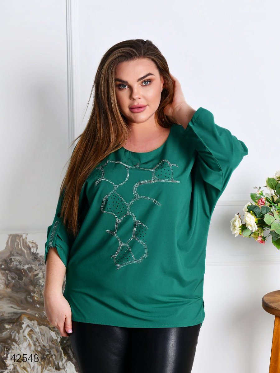 Жіноча блузка вільного крою. Жіноча блузка вільного крою. Силует блузки вільний. Горловина кругла. Рукав прямий, коротшає за допомогою спеціальної деталі на гудзику. Низ асиметричний, спереду трохи коротший, з обох боків невеликі розрізи. Блуза декорована аплікацією з якісних страз.