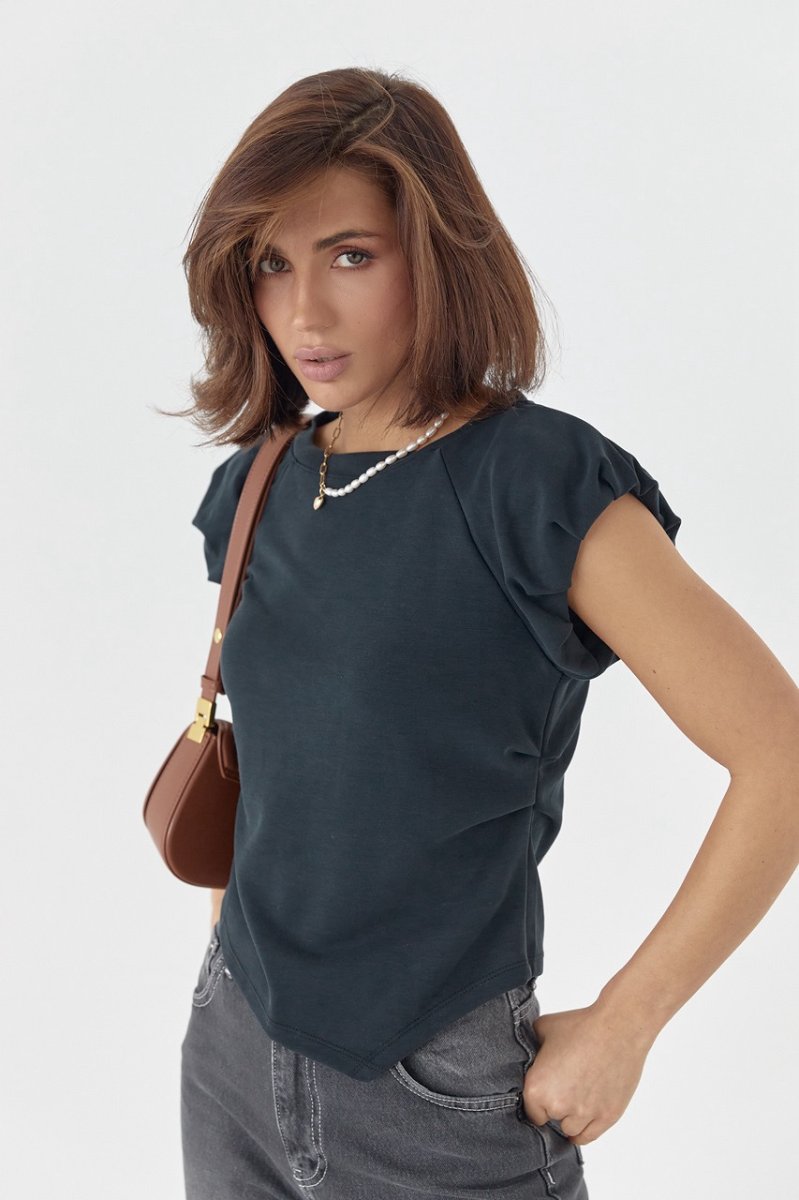 Модель має напівприталений фасон. Горловина кругла, доповнена окантовкою. Короткі рукави-реглан мають пишну форму за рахунок підкладки, яка формує ліхтарик. Низ виробу на спинці прямий, спереду – асиметричний.