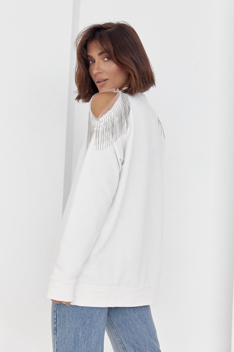 Плечові розрізи, які прикрашені ніжними ланцюжками, нікого не залишать байдужим. У моделі пройми опущені, кругла горловина йде з окантовкою в тон, а прямий низ та довгі рукави доповнені манжетами.