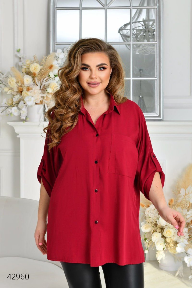Сорочка зі стояче-відкладним комірцем, має вільний прямий силует. Попереду застібається на гудзики по планці. Лінія плеча спущена, рукав прямий, широкий, довжиною 7/8, можна вкорочувати за допомогою спеціальної деталі на гудзику. Низ оформлено двома розрізами з боків.