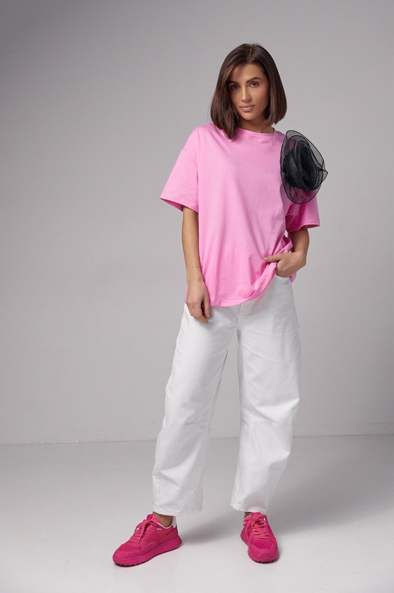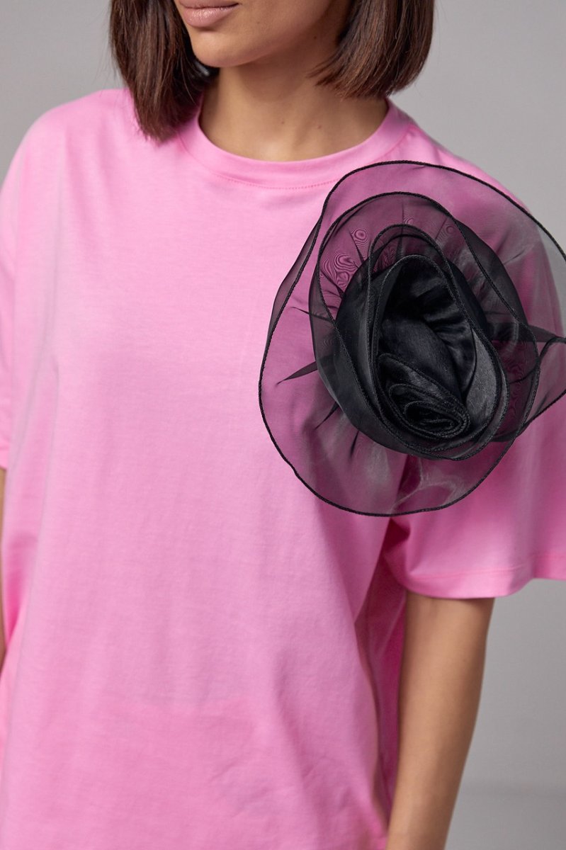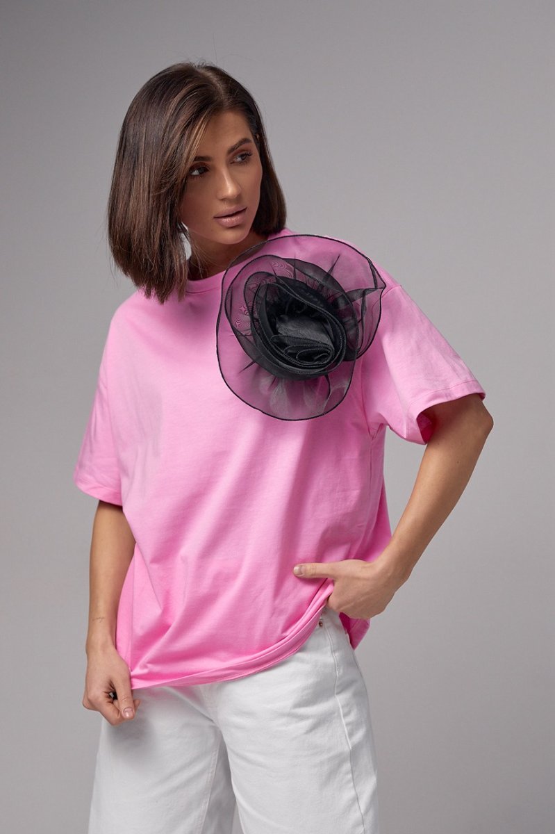 Базова жіноча футболка та оригінальний акцент у вигляді об'ємної квітки - ідеальний тандем для стильного образу. Ця модель легко перетворить ваш образ і зробить його елегантним і привабливим.