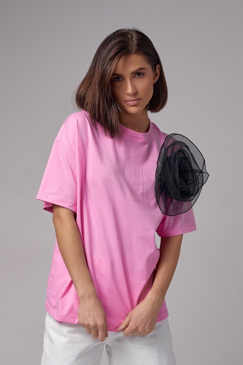 Футболка йде з прямими краями внизу, короткими рукавами та круглою горловиною, обшитою бейкою в тон. Квітка, яка фіксується за допомогою клейової основи, додає виробу жіночності та вишуканості, роблячи його більш привабливішим та оригінальнішим.