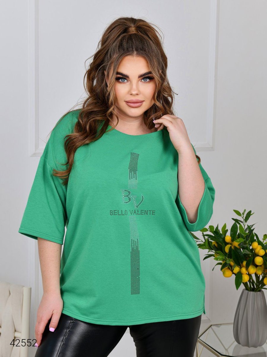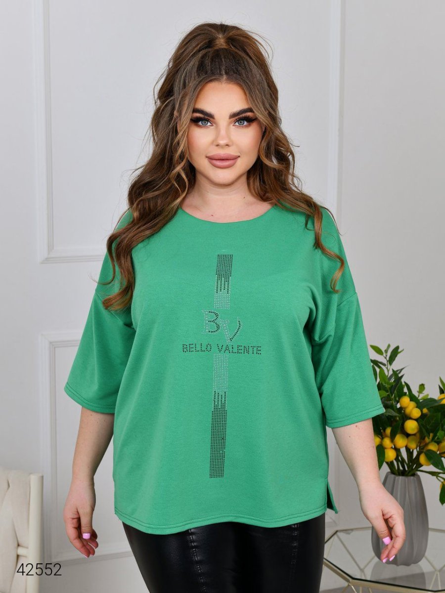 Жіноча туника великих розмірів. Силует туніки прямий, вільний. Виріз горловини круглий. Лінія плеча спущена, рукав довжиною до ліктя. З боків невеликі розрізи. Туніка декорована аплікацією зі страз.