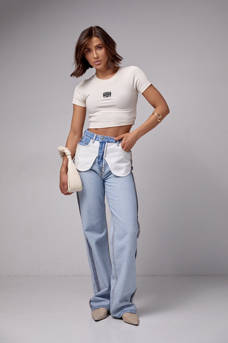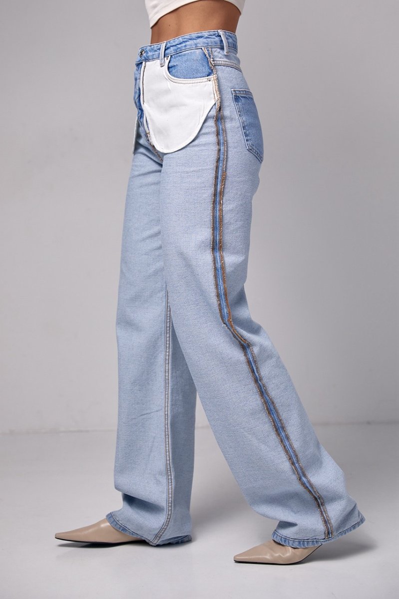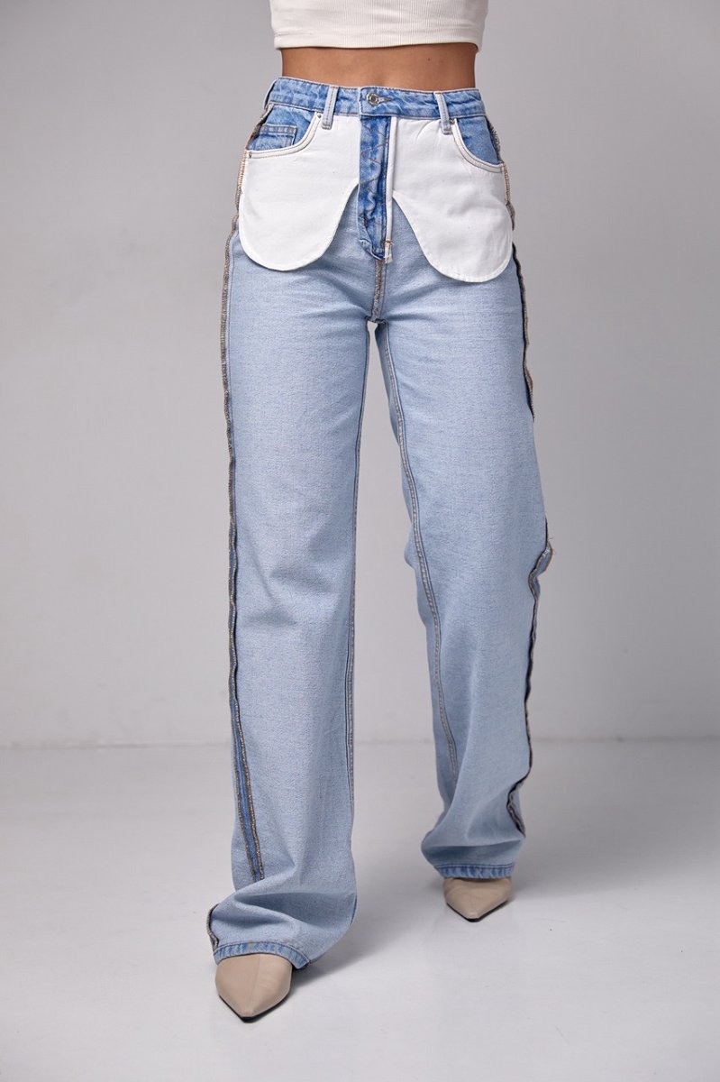 Пояс - відрізний з шльовками. Спереду розташовані бічні кишені з додатковими накладками, ззаду накладні. Застібка - центральна на гудзик та замок. На задніх половинках штанів розташована кокетка для гарної посадки штанів в області талії та стегон. Бічні шви в джинсах виконані навиворіт.