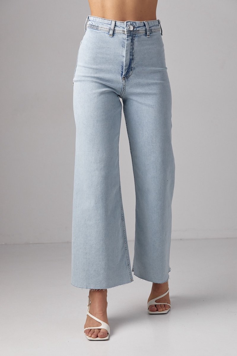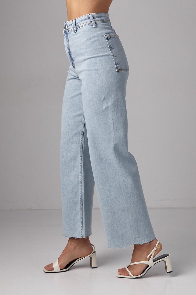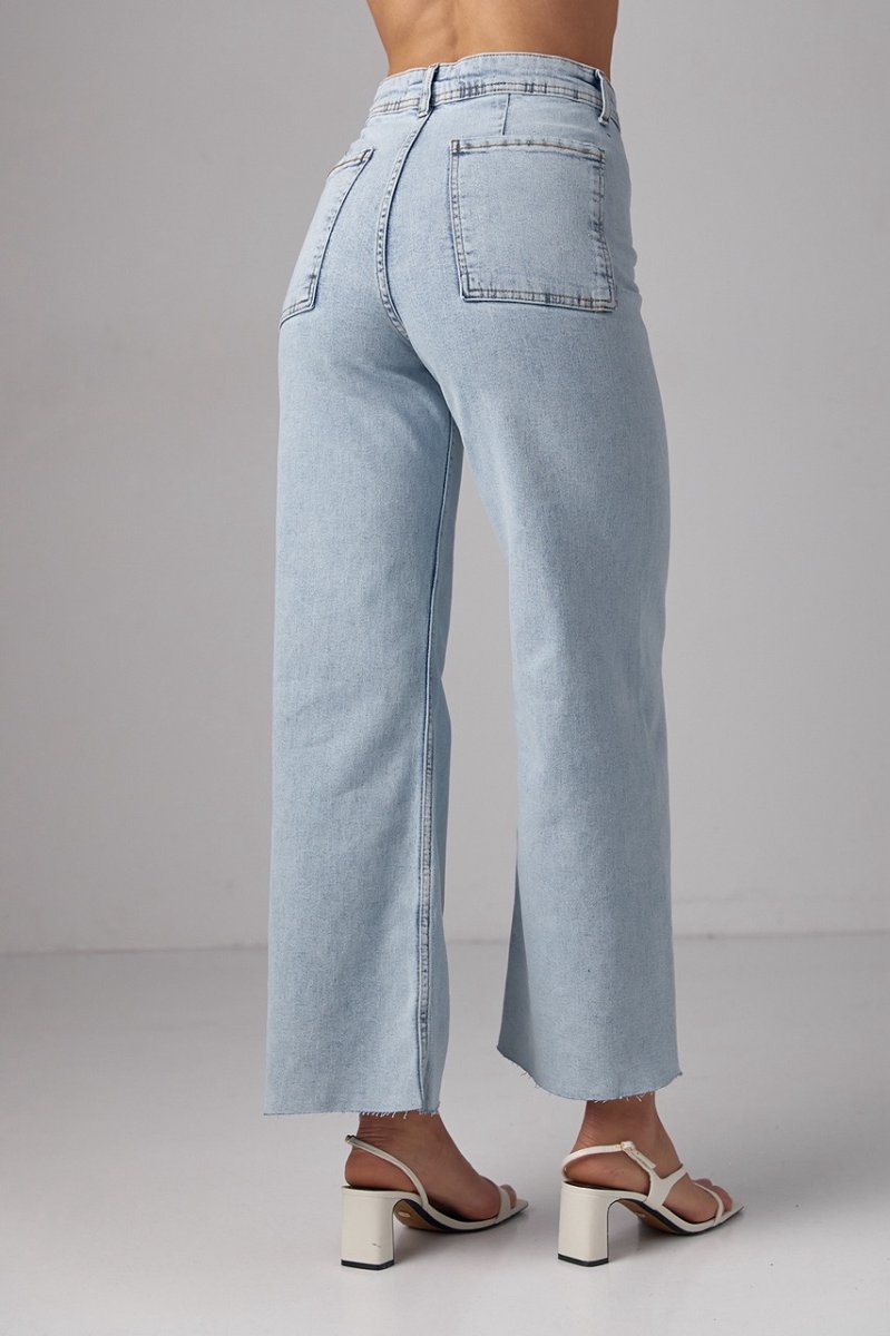Пояс — відрізний із шльовками. Позаду розташовані накладні кишені. Застібка - центральна на гудзик та замок. На задніх половинках штанів розташовані виточки для гарної посадки штанів в області талії та стегон.