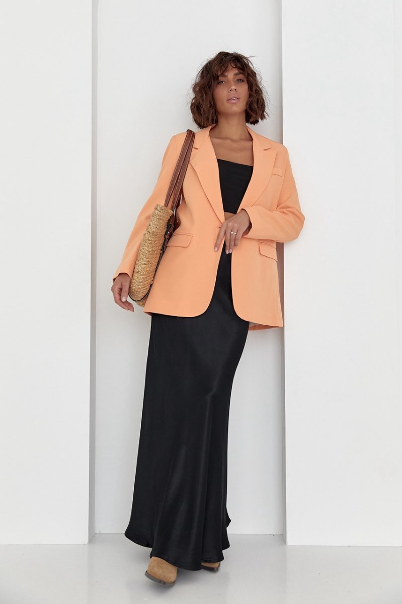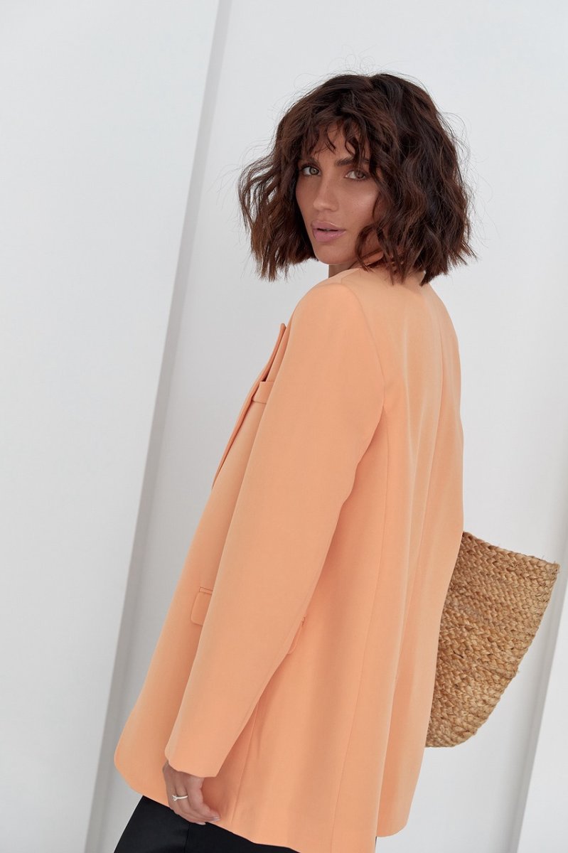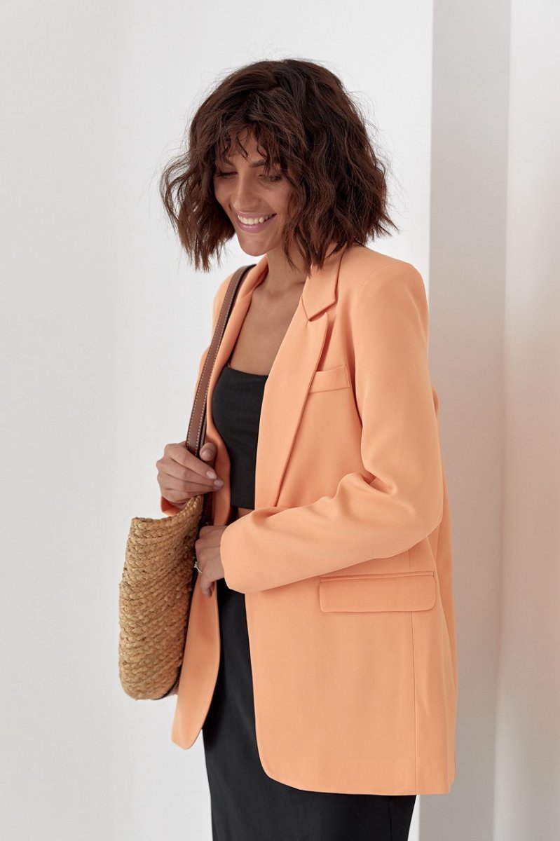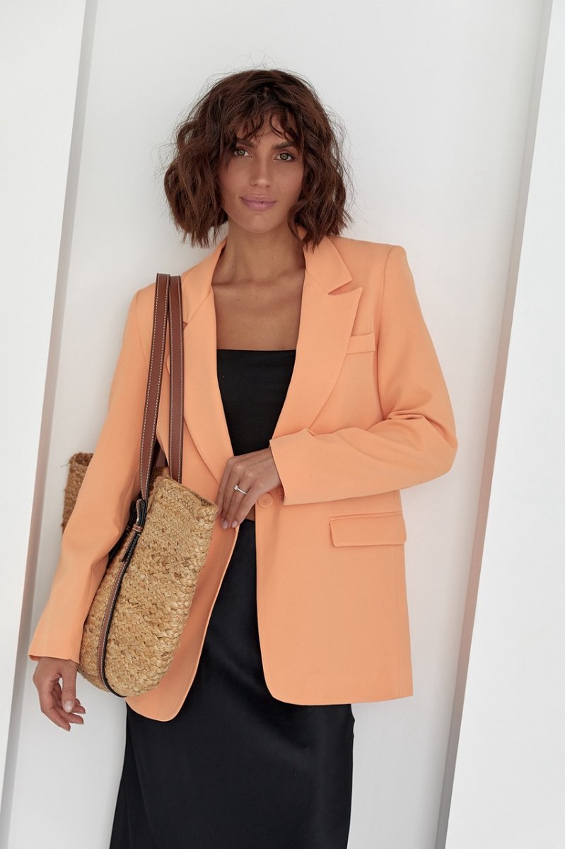 Ця модель з костюмної тканини йде на гладкій підкладці та з поролоновими плечовими накладками, вшитими всередині. Довгі класичні рукави йдуть із двома швами, краї низу прямі, а V-подібна горловина доповнена англійським коміром. Спереду розташовані клапани з кишенями (для використання кишень рядок необхідно розпороти). Застібається піджак спереду на один великий гудзик.