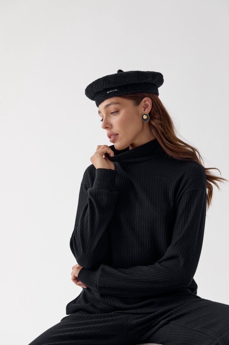 Жіночій костюм прямі брюки і светр. Светр довжиною до рівня стегон, по низу розпірки. Рівень плеча спущений, рукава втачні, довгі, по низу манжети. Спинка з середнім швом. Виріз горловини круглий, комір стійка. По низу светра прокладена строчка. Штани прямі, довгі, на талії пояс із резинкою. Кишені з відрізним бочком. По низу штанок і на поясі прокладені строчки.