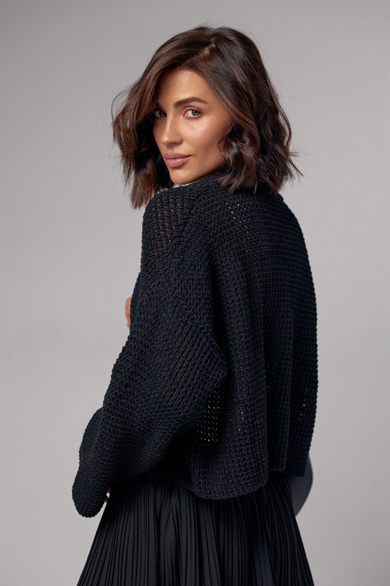 Таку вкорочену в'язану кофтинку можна поєднувати не лише зі спідницями та брюками з високою посадкою, але також і з гарними сукнями, створюючи цікаві образи на кожен день та для особливого випадку.