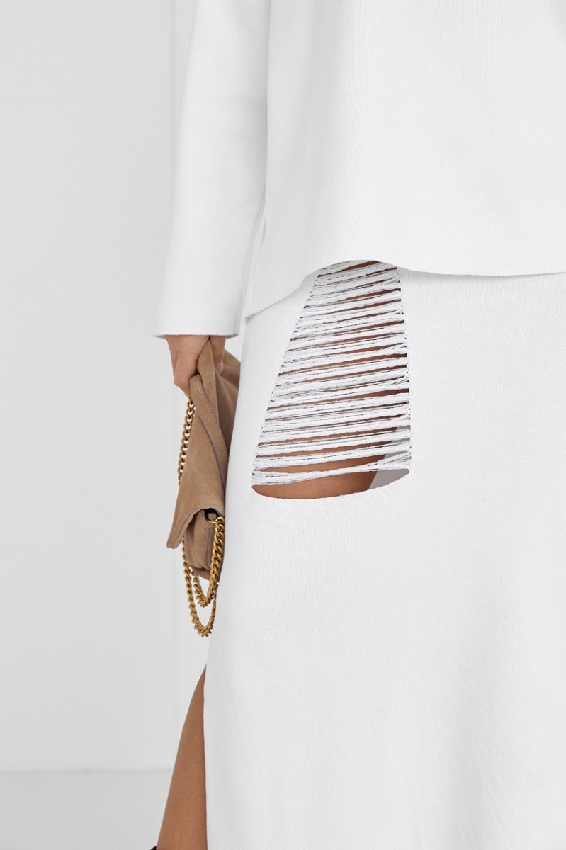 Перша причина закохатися в нашу новинку – приємна на дотик тканина. Друга – ідеальний oversize крій, який не лише на піку популярності, а й подарує максимум комфорту. Третя причина – оригінальний декор у вигляді вирізів на спідниці та спинці джемпера з нитками, які розташовані рядами. І, нарешті, четверта причина – можливість носити окремо кожну річ та отримати ще більше варіантів вражаючих образів!