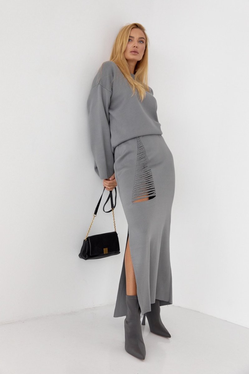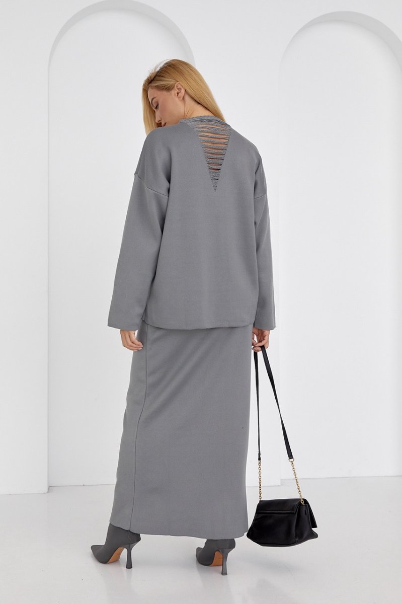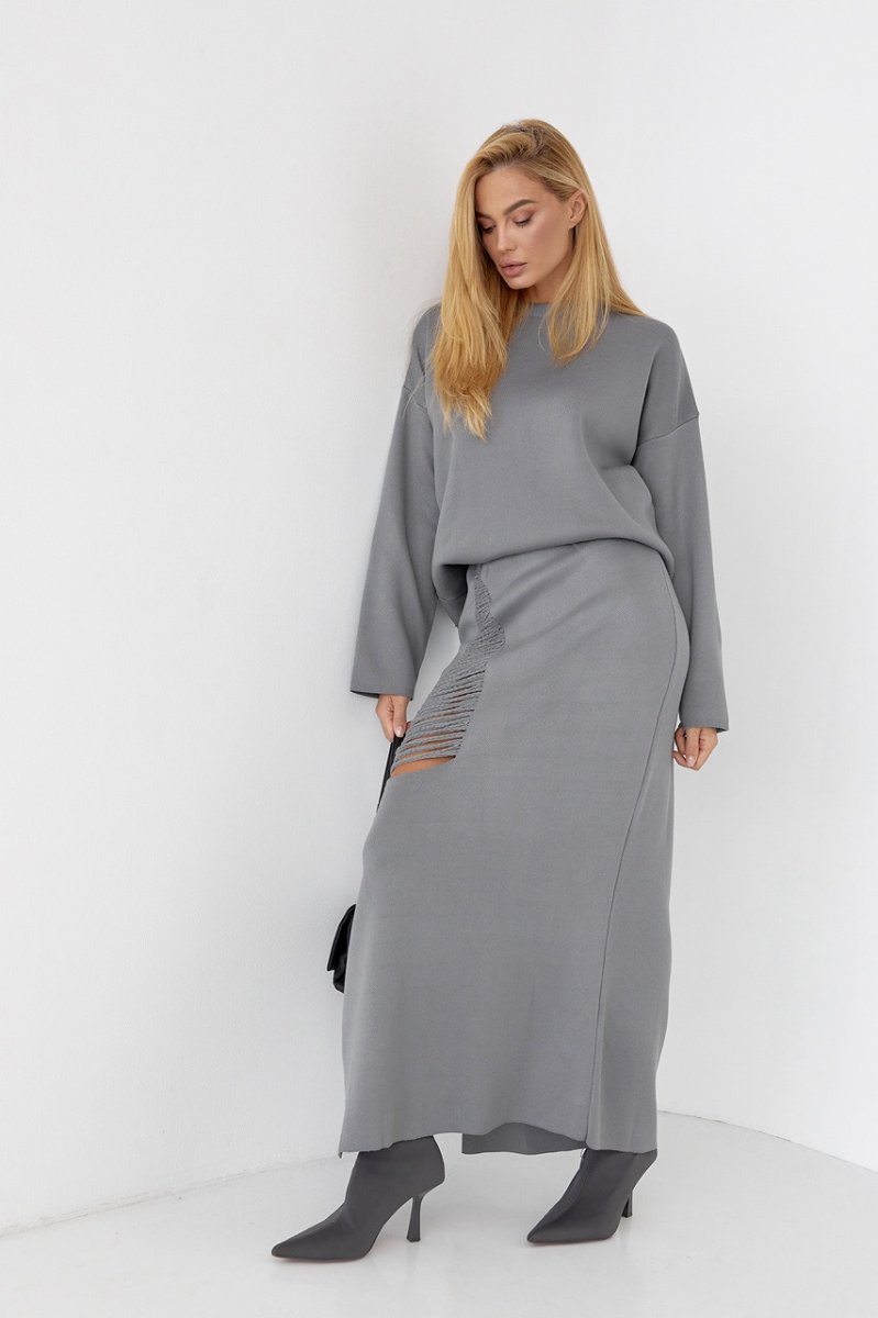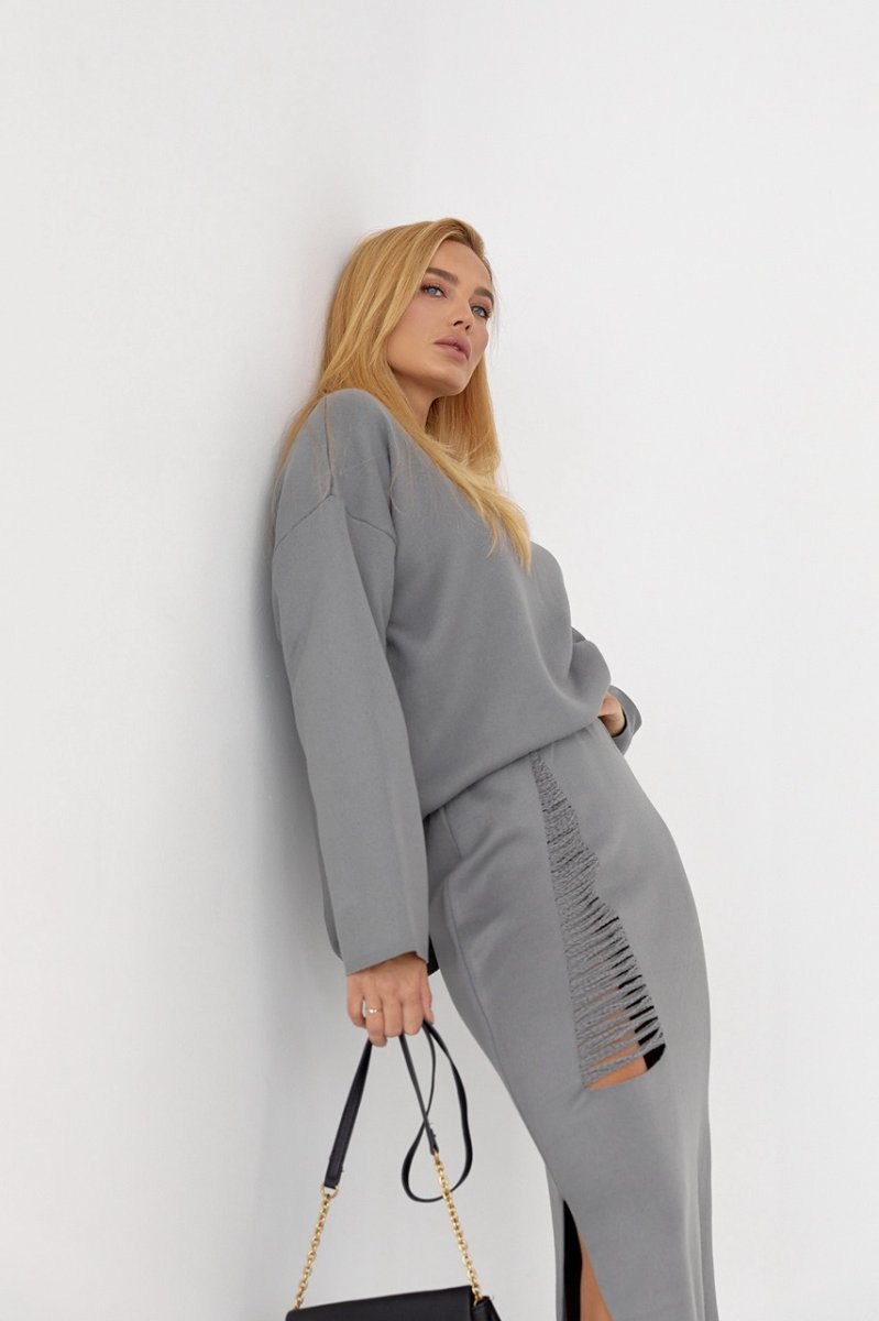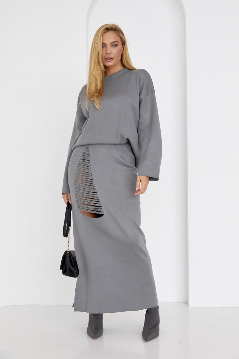 Оригінальний костюм-двійка, що складається з вільного джемпера і прямої спідниці з розпіркою - твій готовий до виходу look, який ти також можеш комбінувати з іншим модним одягом.
