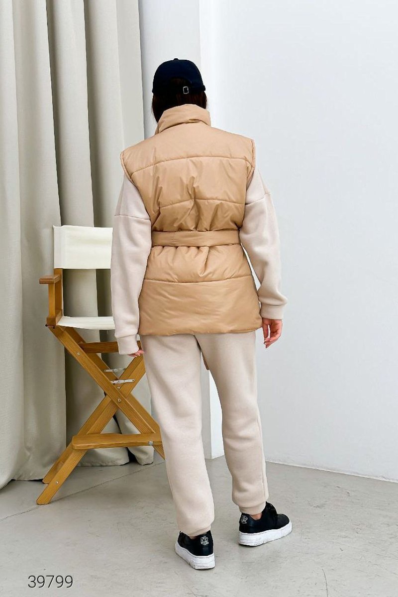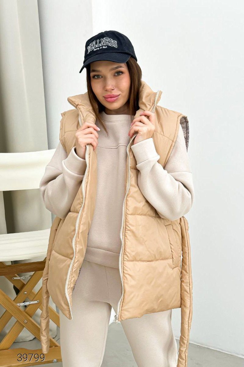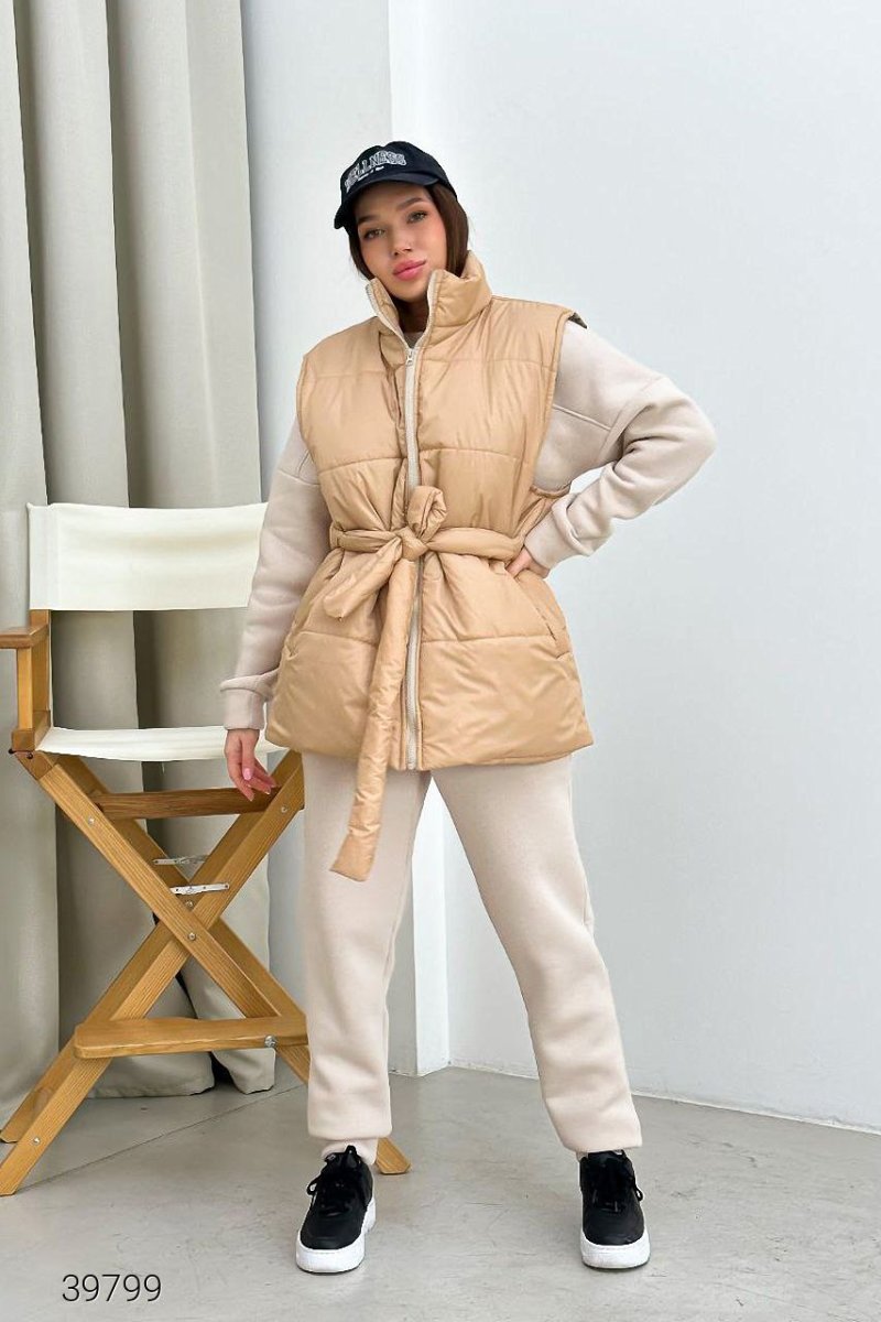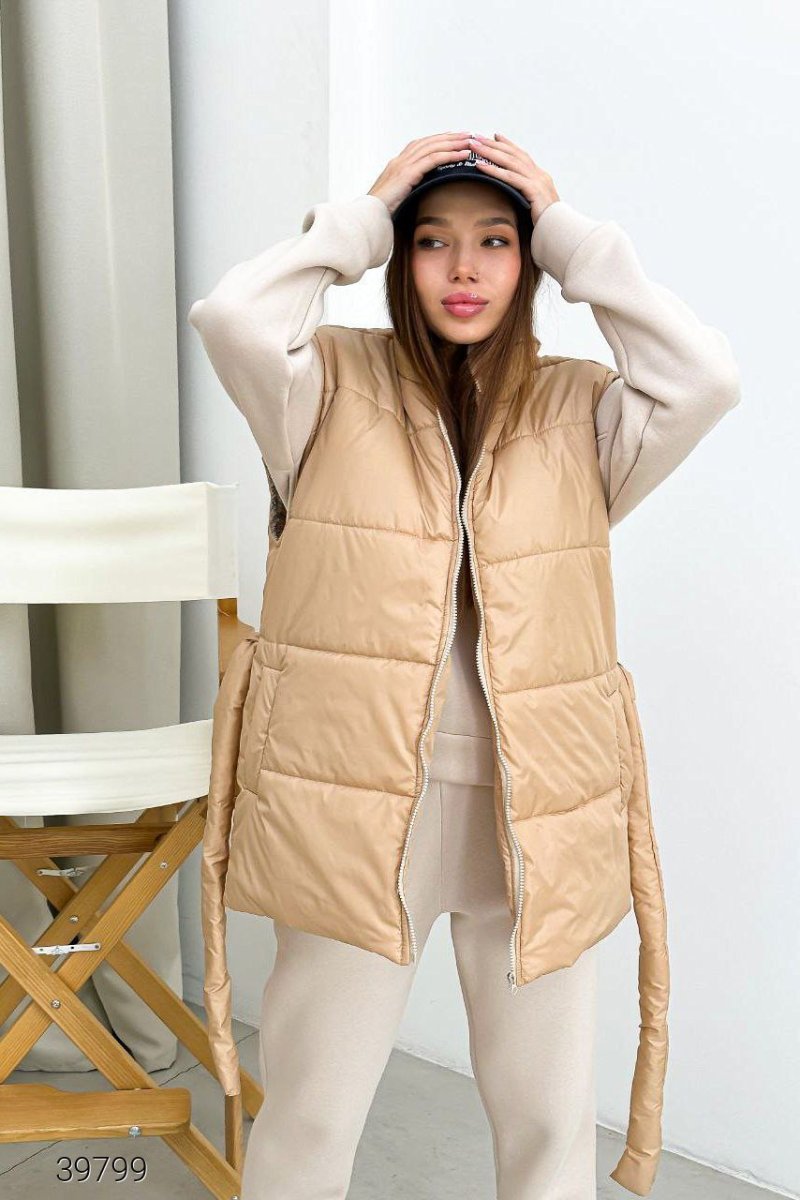 Жилет жіночий стьобаний. Застібається на блискавку, у комплекті пояс. Є кишені. Тканина: водовідштовхувальна плащівка з підкладом, утеплювач силікон 200 г.м2.