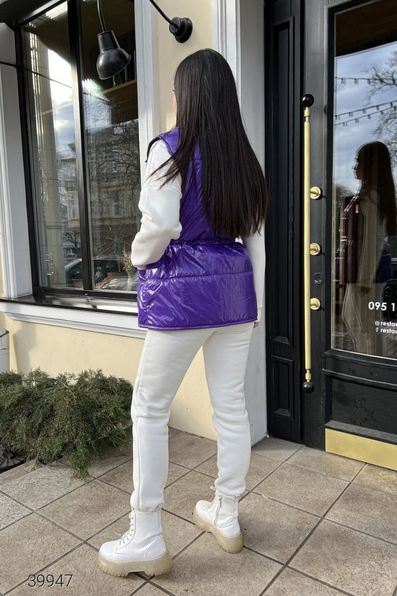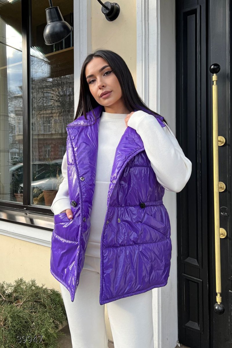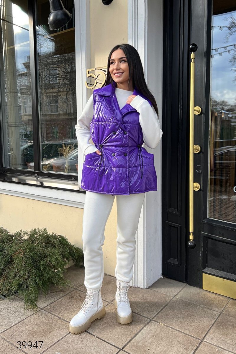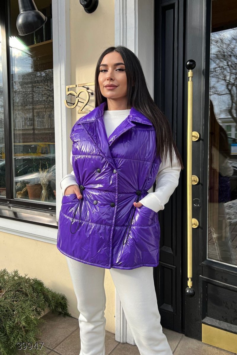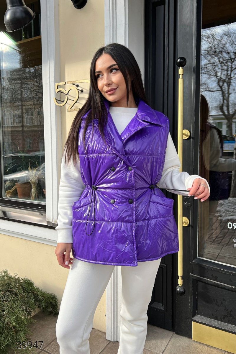 Жилет жіночий стьобаний. Двобортний жилет в стилі оверсайз. За допомогою лаштунки можна регулювати обсяг талії. Тканина: плащівка "Монклер" стьобана на синтепоні 150 г.м2. плюс підклад.
