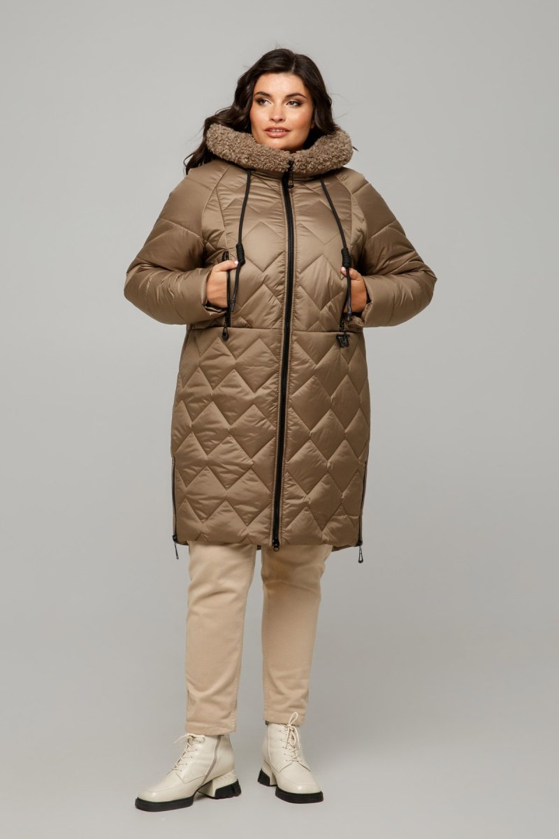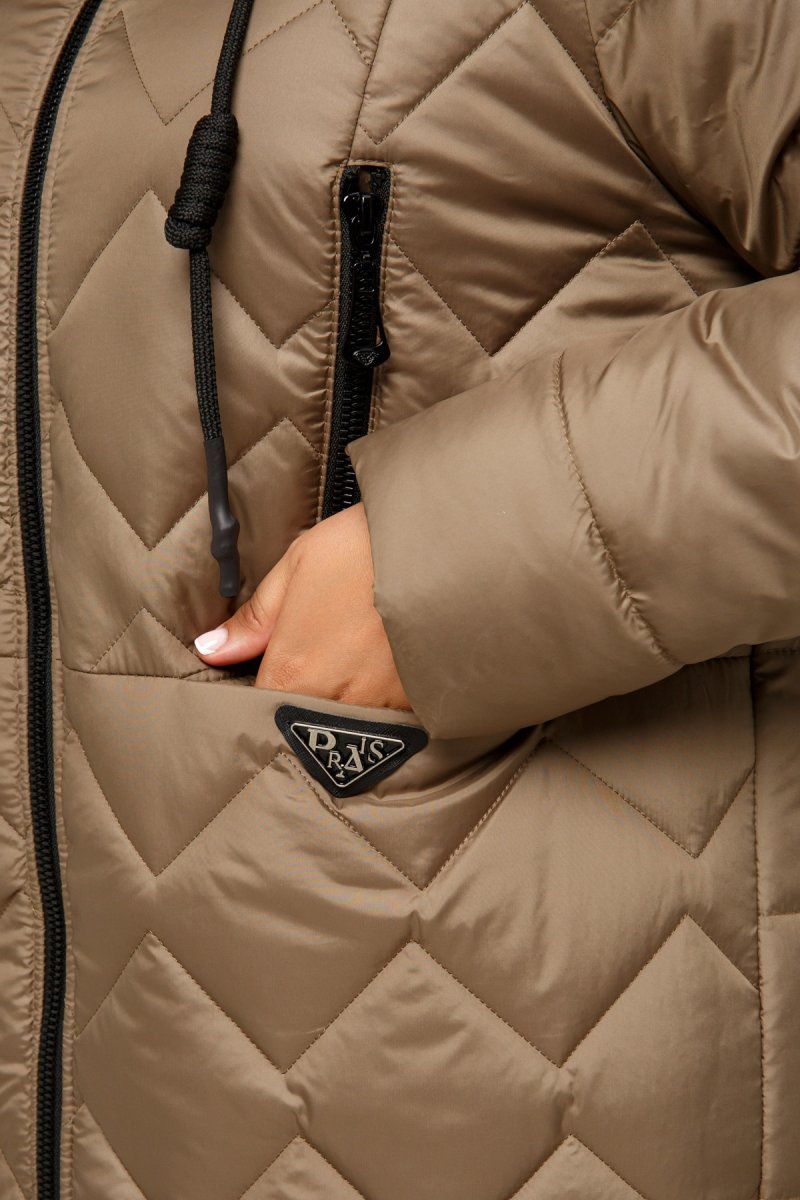 Зимова куртка прямого силуету, звужена донизу. У рельєфних швах полиці виконані кишені на блискавку, по лінії талії- кишеня на кнопку. Бічні шви внизу декоровані блискавкою. Спинка відрізна по лінії талії з імітацією кокетки відліту.