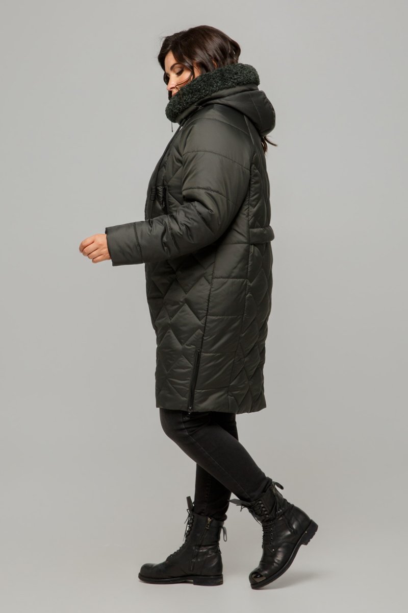 Зимова куртка прямого силуету, звужена донизу. У рельєфних швах полиці виконані кишені на блискавку, по лінії талії- кишеня на кнопку. Бічні шви внизу декоровані блискавкою. Спинка відрізна по лінії талії з імітацією кокетки відліту.
