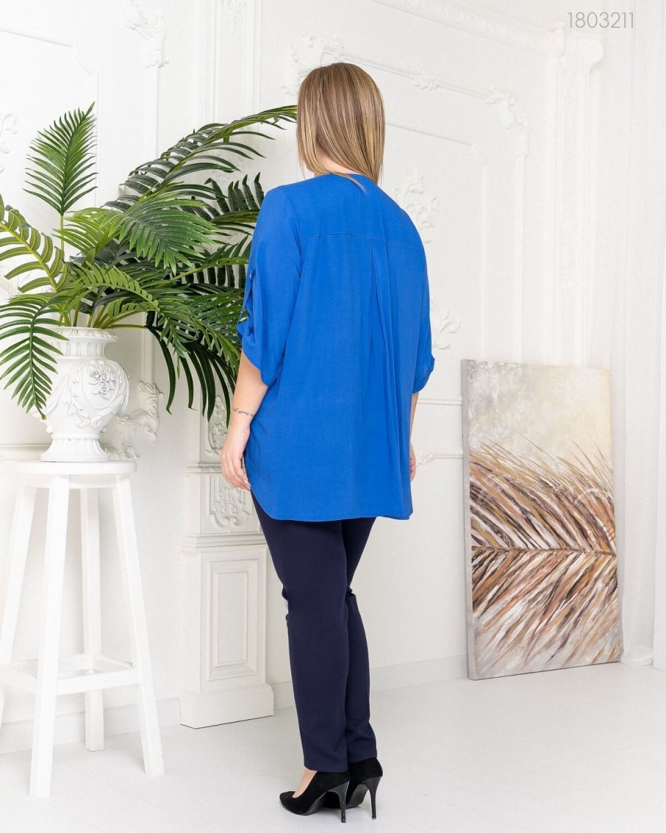 Детали: оригинальный крой, отложной воротник, широкий рукав с патой на пуговице, ассиметричная длина изделия.
