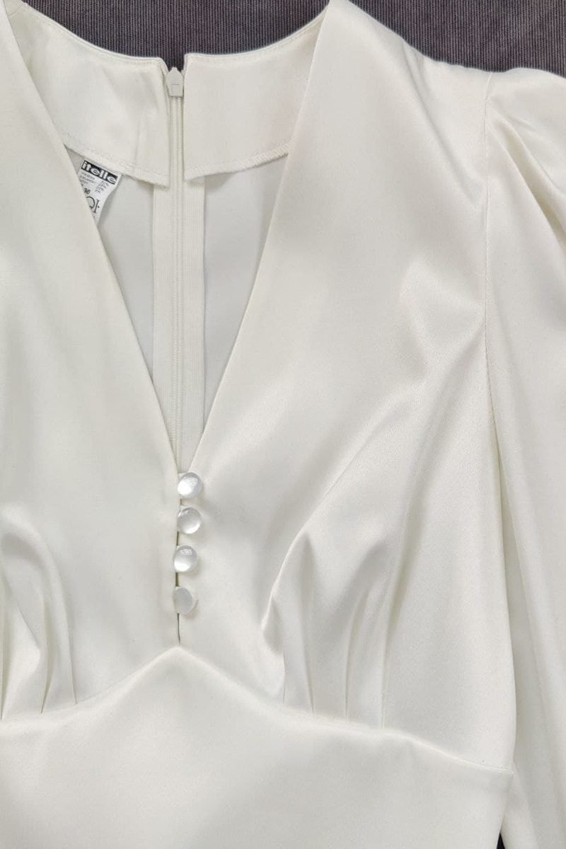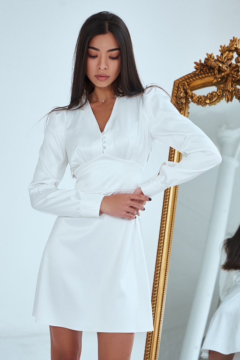 Сдержанное короткое атласное платье с V-подобным вырезом, высоким фигурным поясом, длинным рукавом и юбкой-трапецией. Изюминкой модели являются пуговицы расположенные по полочке и на манжетах. Модель смотрится дорого и роскошно за счет ткани, которая красиво блестит и переливается в лучах света. Застегивается на потайную молнию сзади.