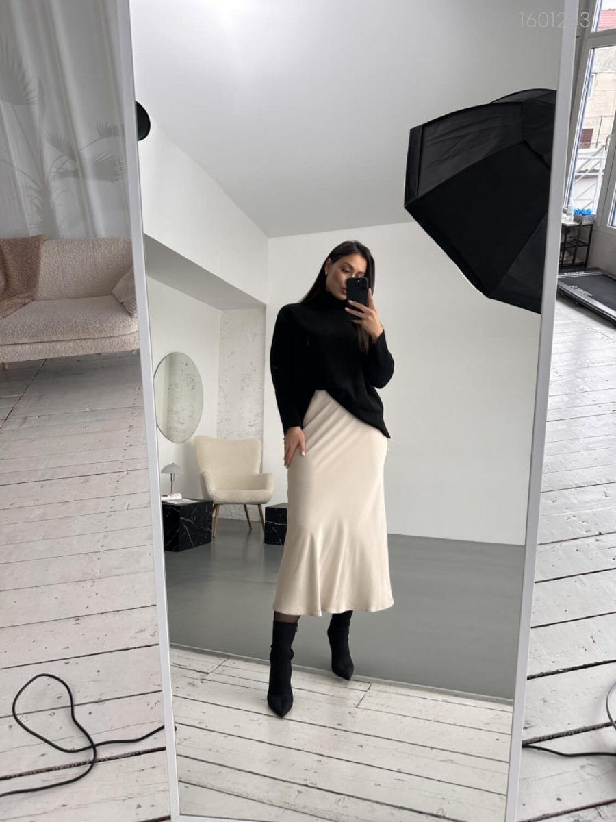 Детали: юбка покроена по косой, за счет чего принимает форму тела, с поясом на резинке, без карманов.