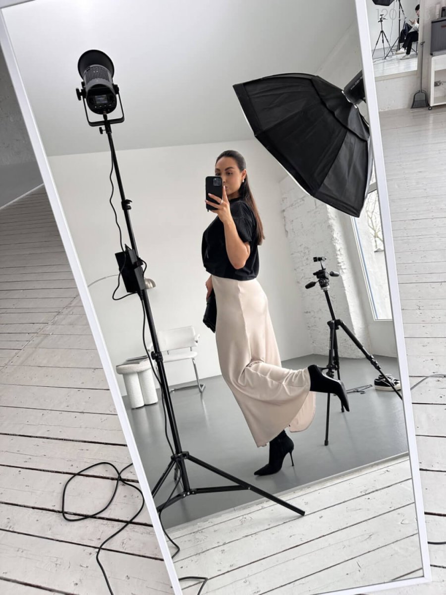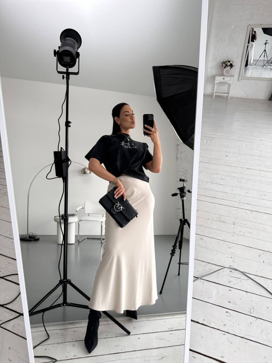 Детали: юбка покроена по косой, за счет чего принимает форму тела, с поясом на резинке, без карманов.
